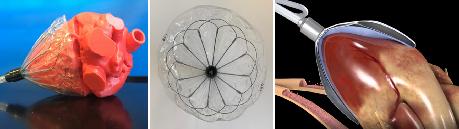 Fig. 6.The CorInnova device. Left: The cup-shaped device is deployed inside the pericardial sac around the ventricles. Shown is a side view of the device around a 3D-printed ovine heart. Middle: Top view of device, which consists of a Nitinol frame that allows self-deployment. Right: The device includes an inner (epicardial) fluid-filled polyurethane film buffering component and an outer polyurethane film active assist component [44, 45]. Images courtesy of CorInnova, Inc.