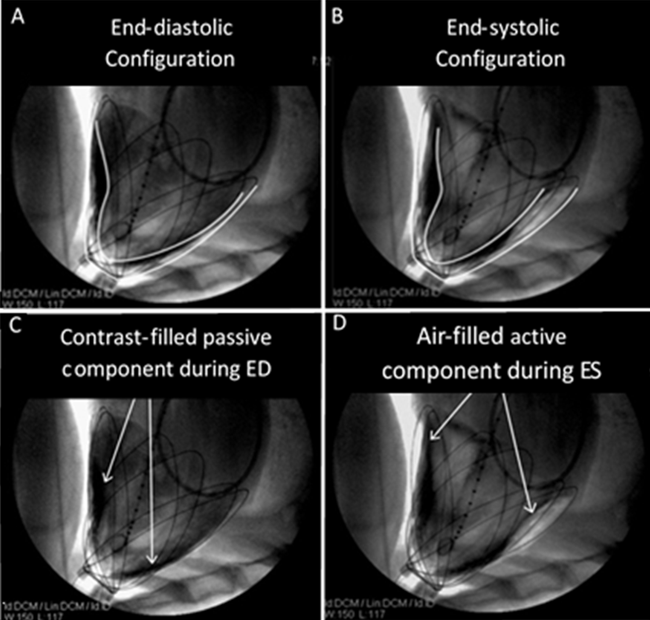 Fig. 7.Fluoroscopic imaging and contour tracings of the heart surface and CorInnova device in acute animal studies. Unlike previous epicardial assist devices, the CorInnova device assists without inverting native heart curvature (A,B). The device becomes intrinsically pneumatically coupled to the heart as soon as the fluid component is filled (C) and free air is evacuated from the chest, so that the heart is not ejected from the device during assist (D). This allows the device to be implanted without invasive attachment methods, such as suturing or vacuum). Reproduced with permission from [47] Moreno MR, Biswas S, Harrison LD, Pernelle G, Miller MW, Fossum TW, Nelson DA, Criscione JC. Assessment of Minimally Invasive Device that Provides Simultaneous Adjustable Cardiac Support and Active Synchronous Assist in an Acute Heart Failure Model. The Journal of Medical Devices. 2011; 5(4): 041008.