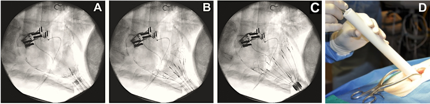 Preimplantation preparations are anticipated to include the typical care for any patient admitted with severe heart failure, including an echocardiogram to help with choosing an appropriately sized CorInnova device. Six device sizes are being tested in current animal experiments, whereas eight sizes will be available for humans. In animals, appropriate device size is determined after anesthesia is induced by using intraoperative fluoroscopy in conjunction with a custom sizing tool and directly measuring the distance from the cardiac apex to the atrioventricular groove anteriorly and posteriorly, which allows calculation of the heart’s diameter at the atrioventricular groove. In humans, it is anticipated that appropriate sizing will be determined preoperatively using echocardiography or cardiac magnetic resonance imaging and confirmed intraoperatively using the same direct measurement of the distance from apex to atrioventricular groove that has been used successfully in animals.