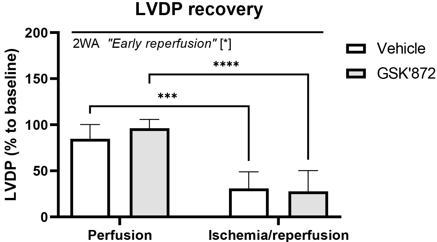 Left ventricular pressure recordings revealed that contractile function of the heart was significantly impaired due to ischemia followed by 10-min reperfusion and that the selective inhibitor of the necroptosis-mediating protein RIP3 did not abrogate myocardial dysfunction. Indeed, post-ischemic recovery of LVDP was comparable in both non-treated and GSK’872-treated I/R group (Fig. 1).
