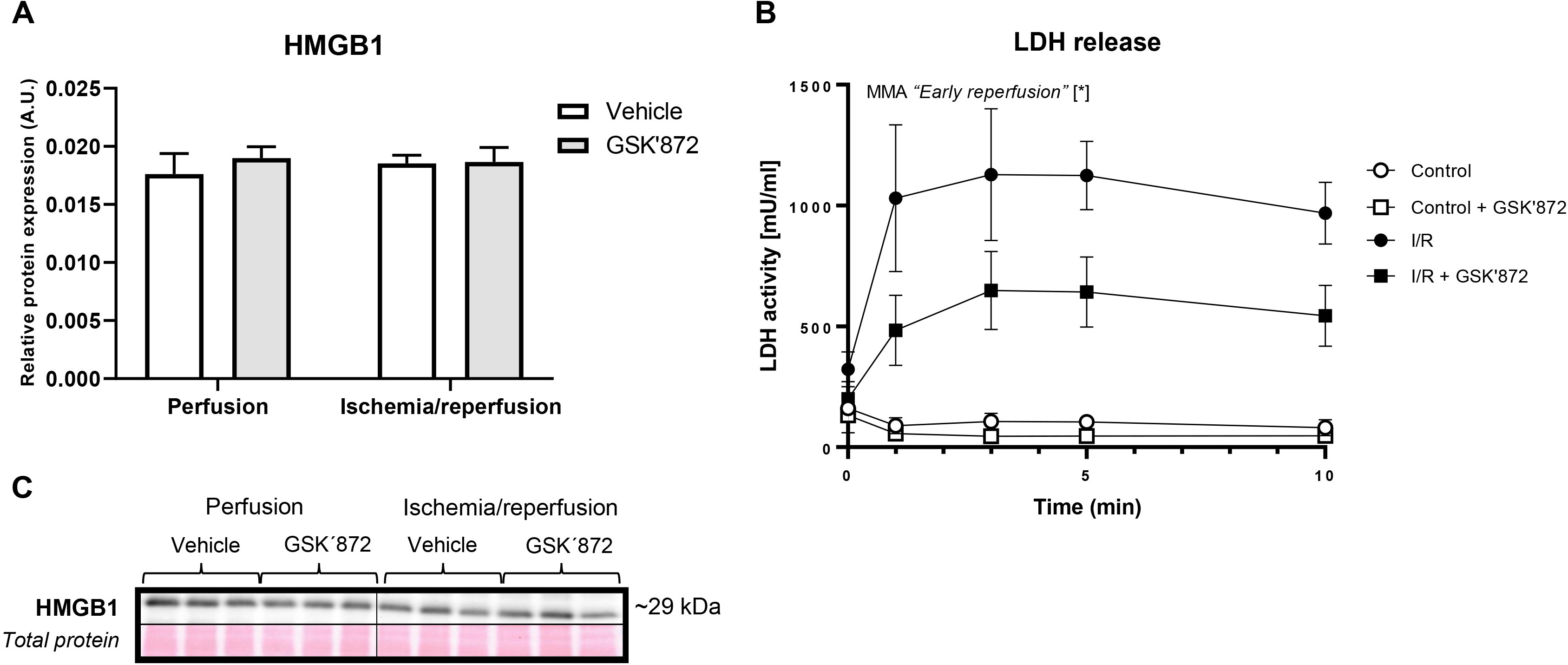 inhibitor—GSK’872 (n = 6); I/R (n = 7); I/R + GSK’872 (n = 7). Intraperitoneal