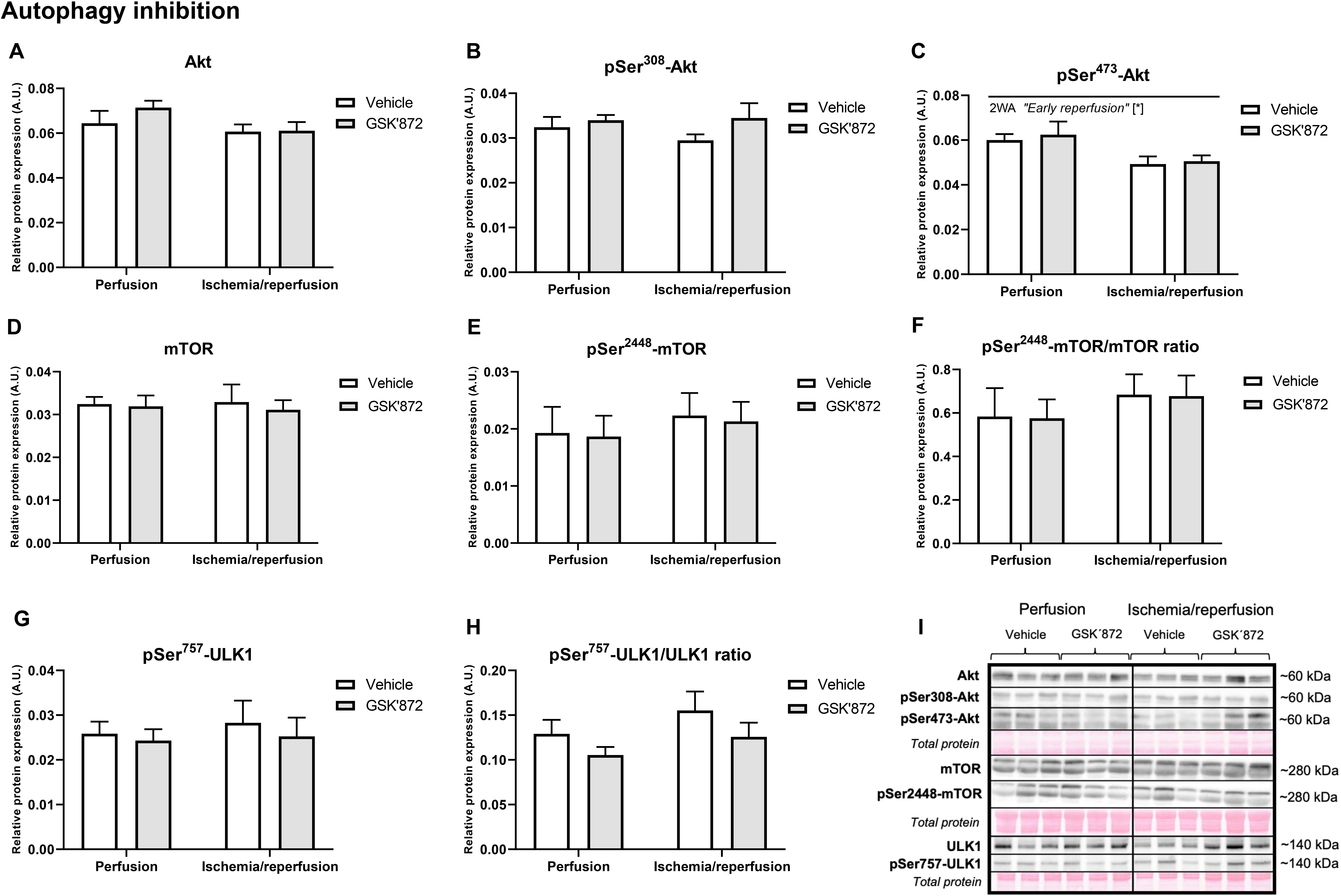 The levels of the main proteins regulating autophagy are shown in Figs. 3,4. The expression of both total (Fig. 3A) and phosphorylated AMPK at Thr172 (Fig. 3B), which is known to be active during ischemia rather than in reperfusion [2], was unaltered in I/R hearts independently of RIP3 inhibition. On the other hand, the pThr172-AMPK/AMPK ratio was suppressed by both the I/R intervention and RIP3 inhibition (Fig. 3C). The pattern of levels of the total ULK1 was consistent with the expression of AMPK (Fig. 3D). On the other hand, after 10-min of reperfusion and regardless of the presence or absence of GSK’872 there was a decrease in the active phosphorylated (Ser555) form of ULK1 (Fig. 3E) as well as its ratio to total ULK1 (Fig. 3F). The expression of LC3-I having a conspicuous role in the initiation of autophagosome formation [7], was increased due to such an acute I/R treatment, while two-way ANOVA analysis revealed the significance in the interaction of I/R and the treatment only (Fig. 3G). In contrast, LC3-II, which translocates rapidly to nascent autophagosomes [7], was decreased by I/R. Moreover, RIP3 inhibition under I/R caused even more prominent suppression in LC3-II expression (Fig. 3H). The conversion of LC3-I to LC3-II, which is indicative of autophagic activity [8], was suppressed by I/R irrespective of the presence or absence of the anti-necroptotic agent (Fig. 3I). Nevertheless, at this early reperfusion phase of previously ischemic heart the expression of Beclin-1 was suppressed (Fig. 3J) whilst the presence of GSK’872 did not affect this autophagic mechanism. Representative immunoblots of the investigated proteins are shown in Fig. 3K. During early reperfusion, except for pThr473-Akt being downregulated, none of the investigated proteins involved in autophagy inhibition were altered. RIP3 inhibition was unable to modify this part of autophagic signalling (Fig. 4A–I).