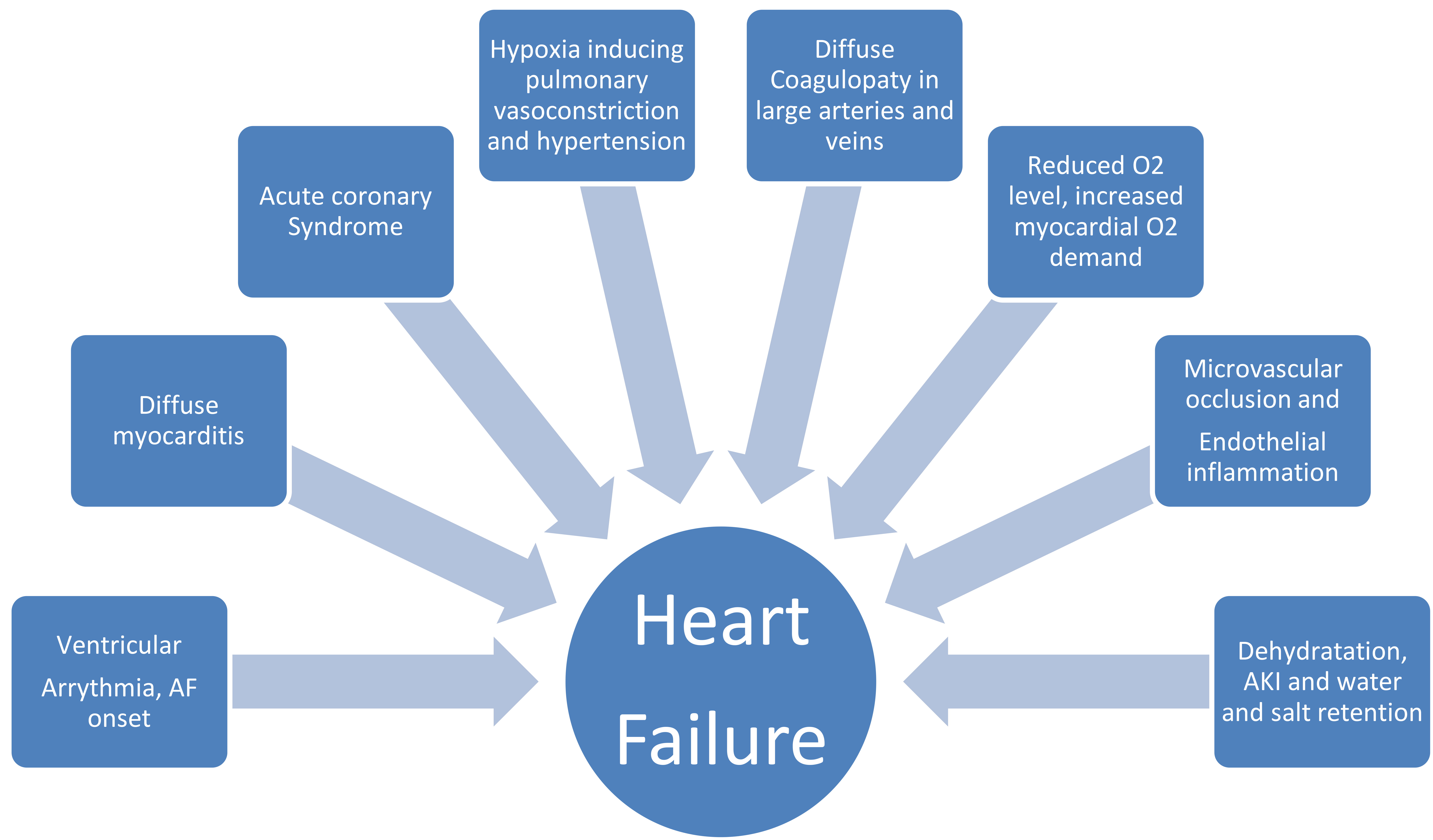 - The modality of HF occurrence and pathophysiological mechanisms causing acute HF during infection encompass micro and macro vascular coronary damage, direct myocyte injury, systemic inflammation and endothelial dysfunction, but it is not know the exact HF ethiology leading to HFrEF or HFpEF.