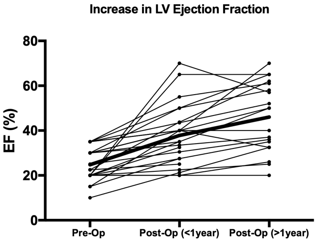Primary endpoints for this study were changes in EF and mortality at 30 days and in the mid-term (beyond 1 year post-op). Changes in EF and LV dimensions over time were measured by echocardiography done during follow-up visits. These follow-ups were obtained regularly and at periodic intervals as post-operative visits or follow-ups in clinics. A typical follow-up consisted of clinical examination and serial echocardiography. Where direct patient follow-up was not possible, follow-up was obtained from the patient’s family physician.