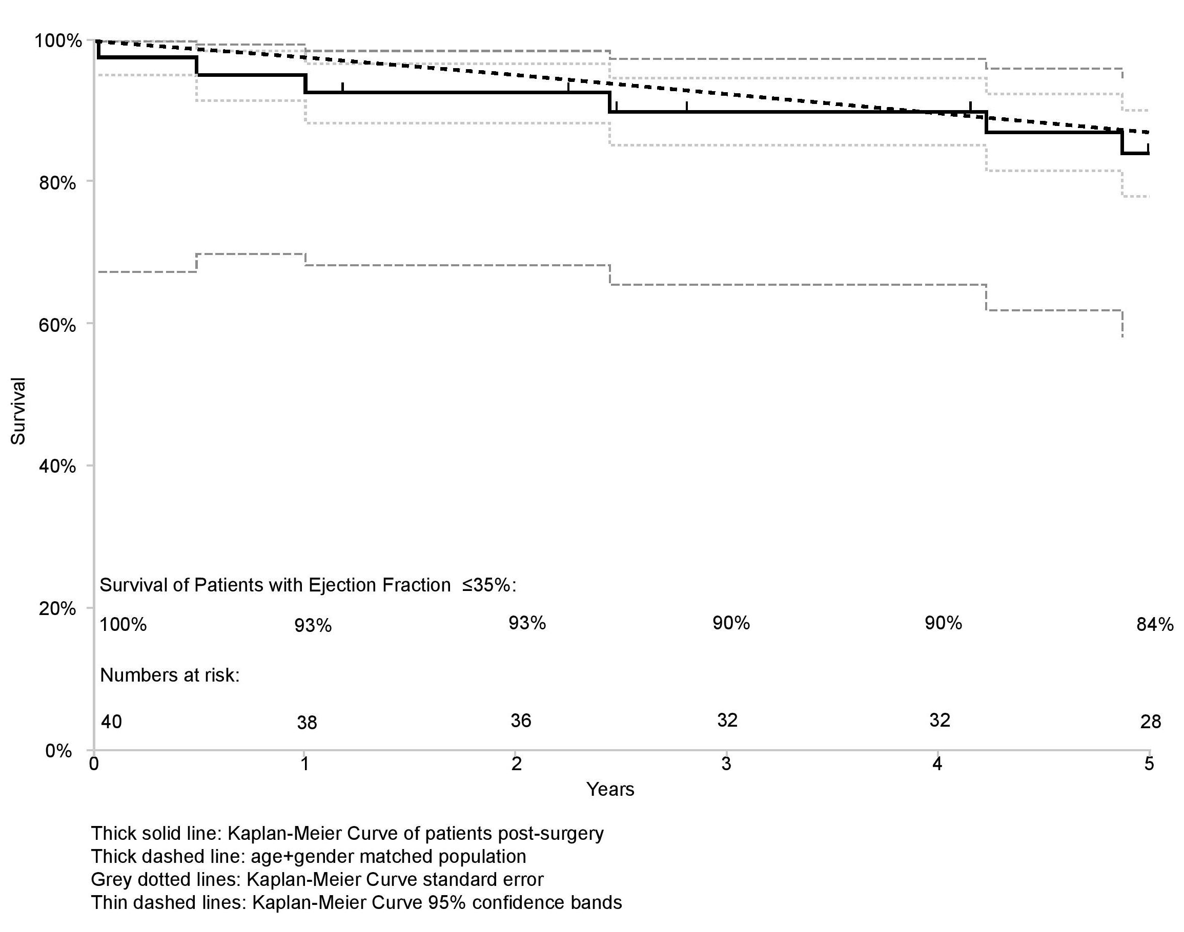Fig. 2.Kaplan-Meier curves for the post-op and age/gender-matched control cohorts. Note, remarkably, that survival of the low-EF surgical group equals that of the normal age and gender matched population.