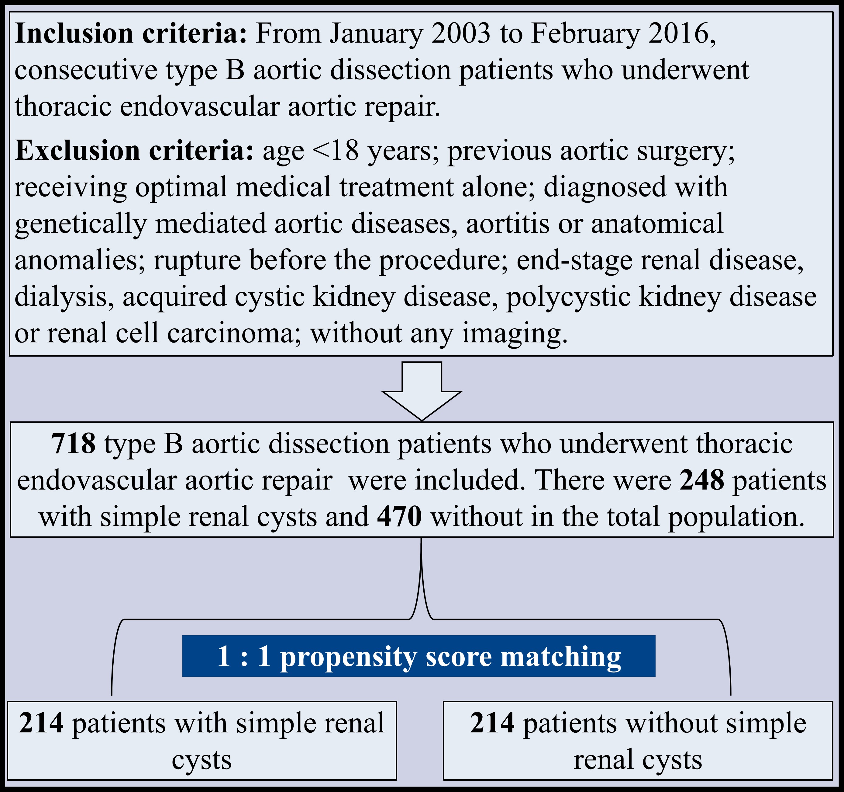 Recently published studies have found an association between simple renal cysts (SRC) and aortic dissection/aneurysm [3, 4]. However, the perioperative characteristics and long-term outcomes of BAD patients with SRC that undergo TEVAR remain unclear. In this context, a multi-center retrospective study was conducted. First of all, differences in perioperative characteristics and intraoperative details between SRC and non-SRC groups were compared. Moreover, a propensity score matching was performed to minimize selection bias. The differences in long-term outcomes between the two groups were compared in the overall and matched study populations. Finally, subgroup analysis was performed to identify which subpopulations of SRC patients sustained the highest risk of ARAEs after TEVAR.
