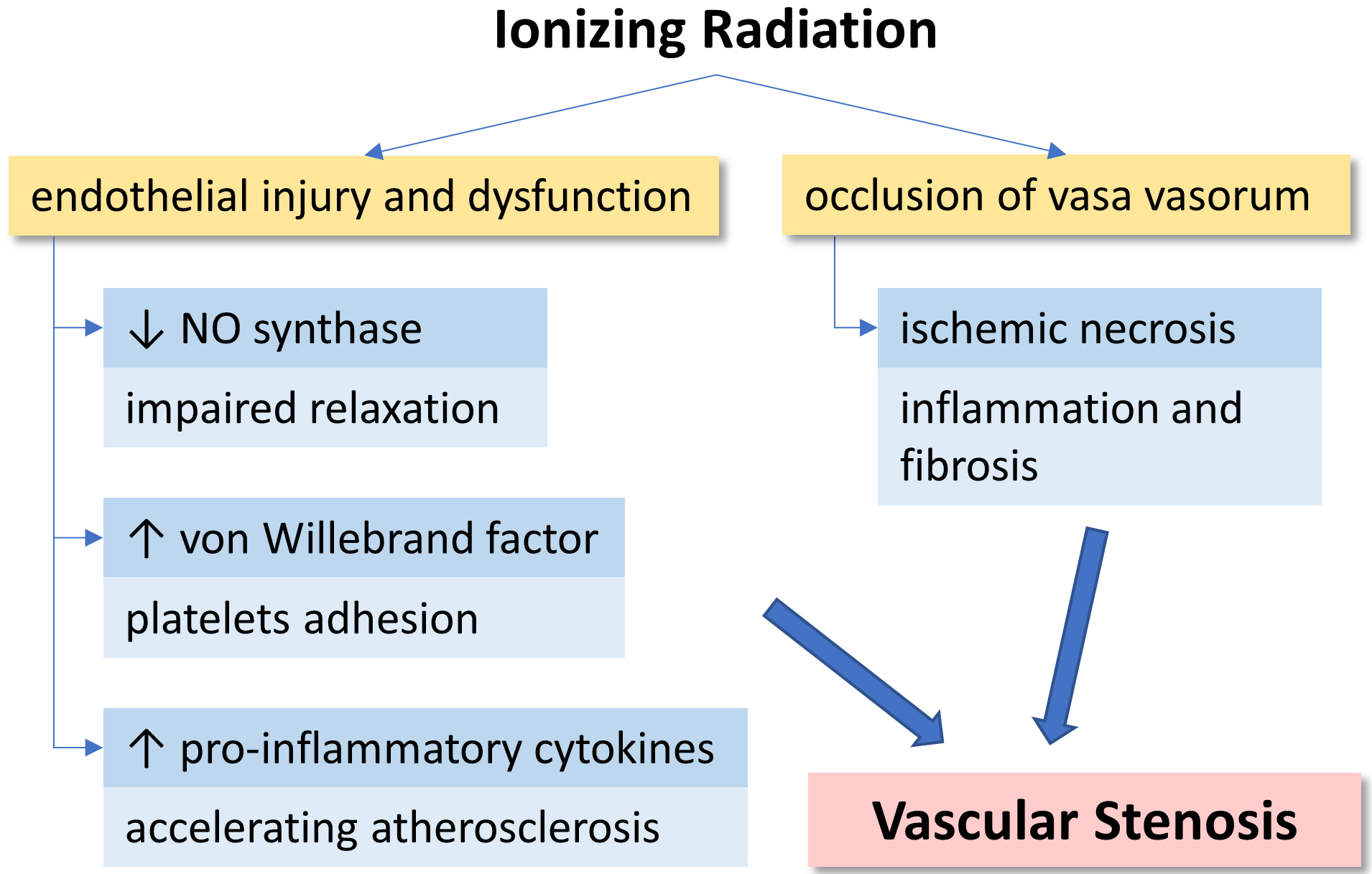 Fig. 1.Pathogenesis of radiation-induced vascular stenosis. Two major mechanisms, endothelial dysfunction and occlusion of vasa vasorum contributed to the result.