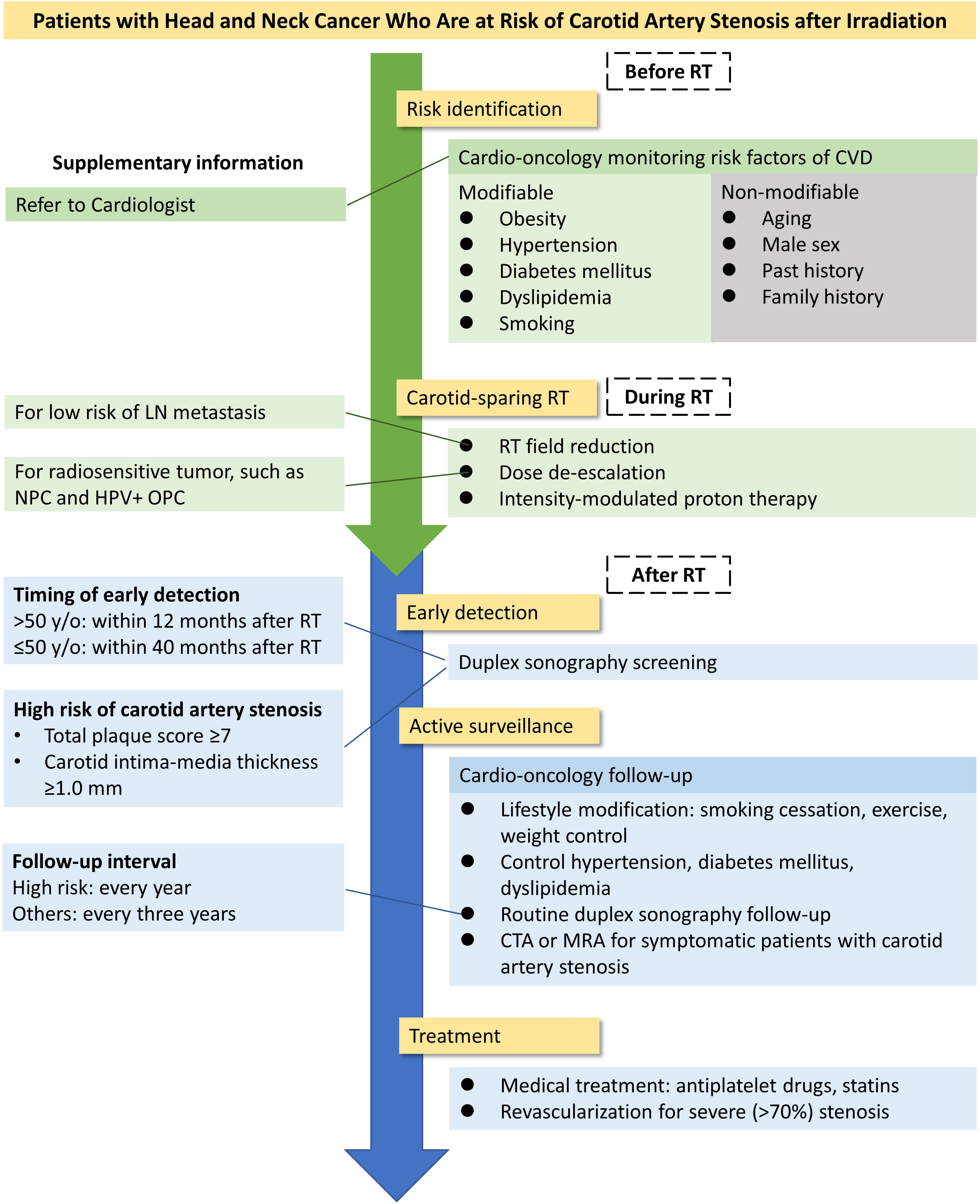 Fig. 2.Approach for patients with head and neck cancer treated with radiotherapy. Abbreviations: CTA, computed tomography angiography; CVD, cardiovascular disease; HPV+OPC, human papillomavirus positive oropharyngeal cancer; LN, lymph node; NPC, nasopharyngeal cancer; MRA, magnetic resonance angiography; RT, radiotherapy.