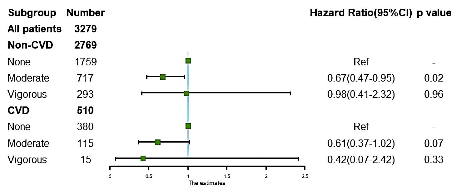 The subgroup analysis (Fig. 2) showed that moderate LTPA reduced the risk of all-cause death by 33% in patients without CVD (HR: 0.67, 95% CI: 0.47–0.95, p = 0.02). However, for patients with complicated conditions with CVD, moderate LTPA did not have significant benefits (HR: 0.61, 95% CI: 0.37–1.02, p = 0.07). Vigorous LTPA did not improve the survival outcomes regardless of the presence of CVD (non-CVD: HR: 0.98, 95% CI: 0.41–2.32, p = 0.96; CVD: HR: 0.42, 95% CI: 0.07–2.42, p = 0.33).