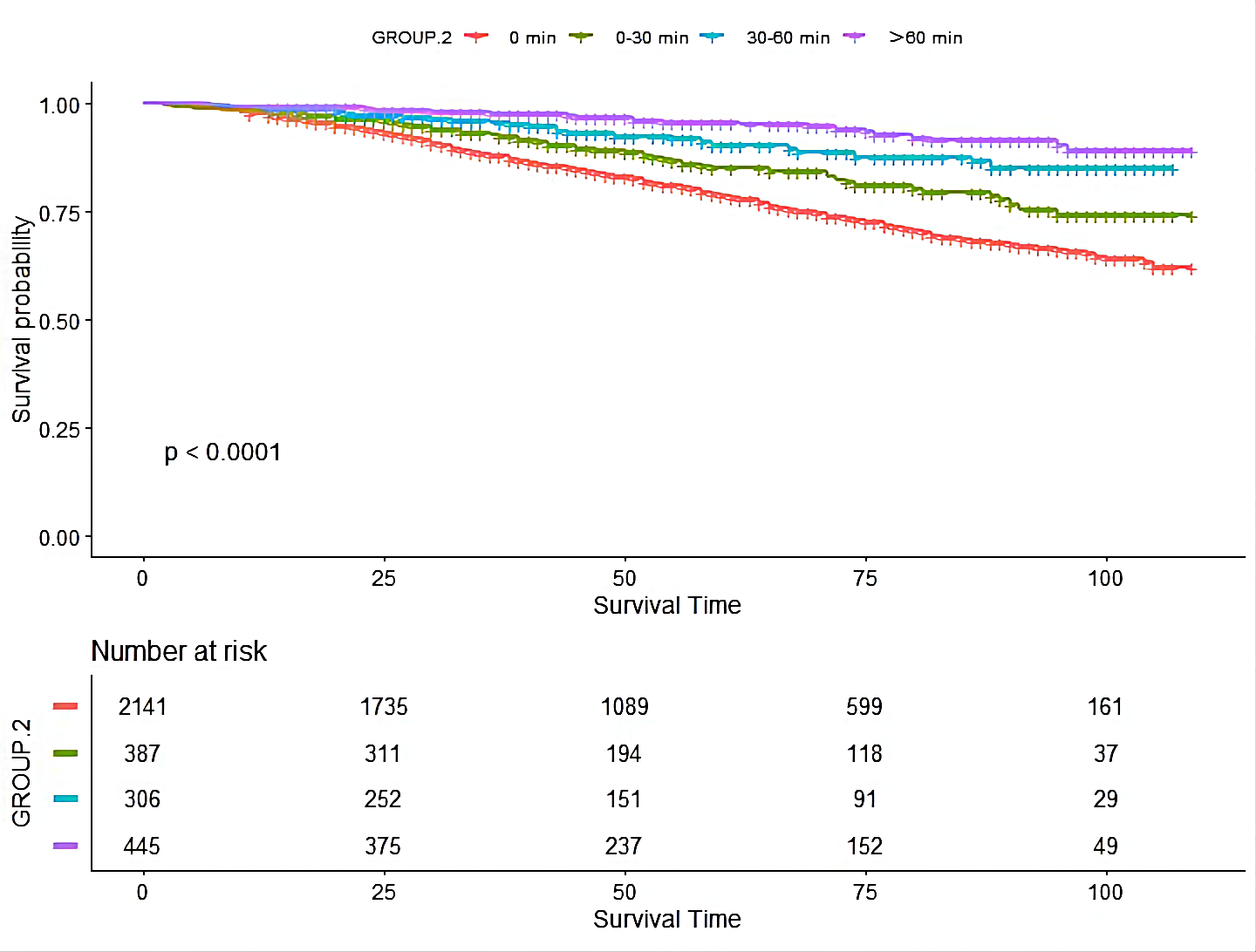 Fig. 3.The Kaplan-Meier (KM) curve of the association between leisure-time physical activity duration with mortality risk in chronic kidney disease patients.