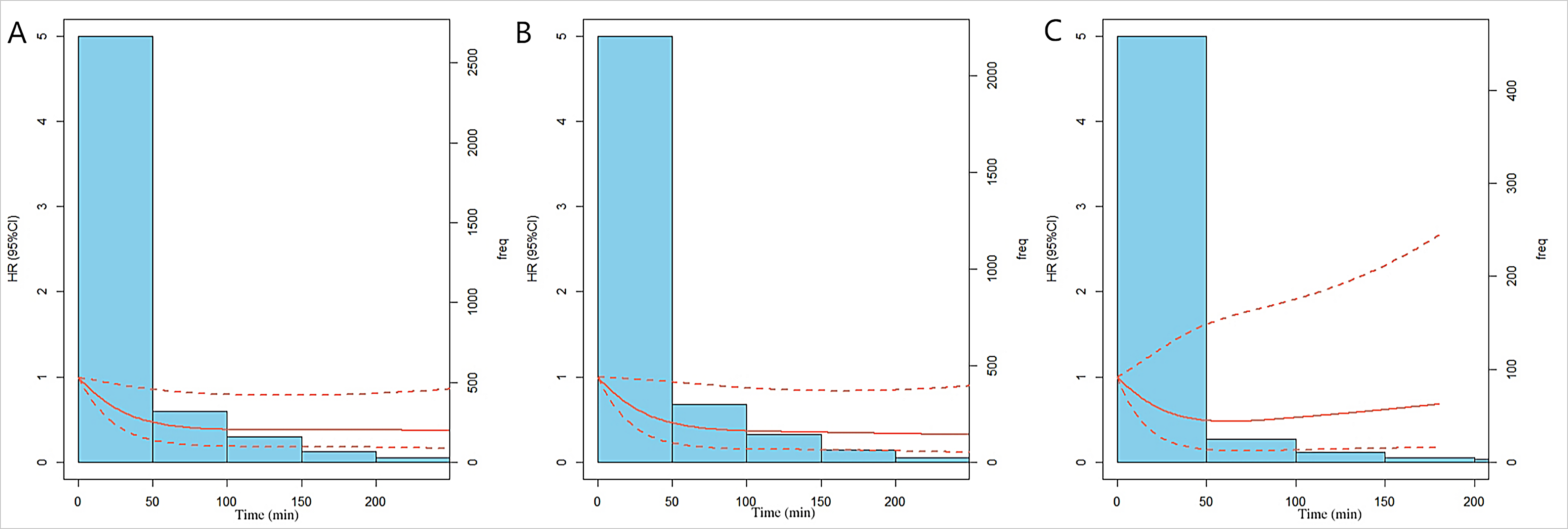 Fig. 4.Relationship between the dose of leisure-time physical activity duration and the risk of mortality in CKD patients, according to the three-knot cubic spline (10, 50, and 90%). The solid line represents the multivariable adjusted hazard ratios (adjusted for sex, blood urea nitrogen, serum potassium, heart failure, hypertension, anemia, and estimated glomerular filtration rate.), with dashed lines showing that 95% of confidence intervals derive from restricted cubic spline regression with three knots. The ordinate value of the dashed lines across 1.0 indicates no significant difference compared with the reference point (0 min). (A) general CKD patients. (B) patients without cardiovascular disease. (C) patients complicated with cardiovascular disease (complications such as heart failure, coronary heart diseases, or with a history of heart attack).