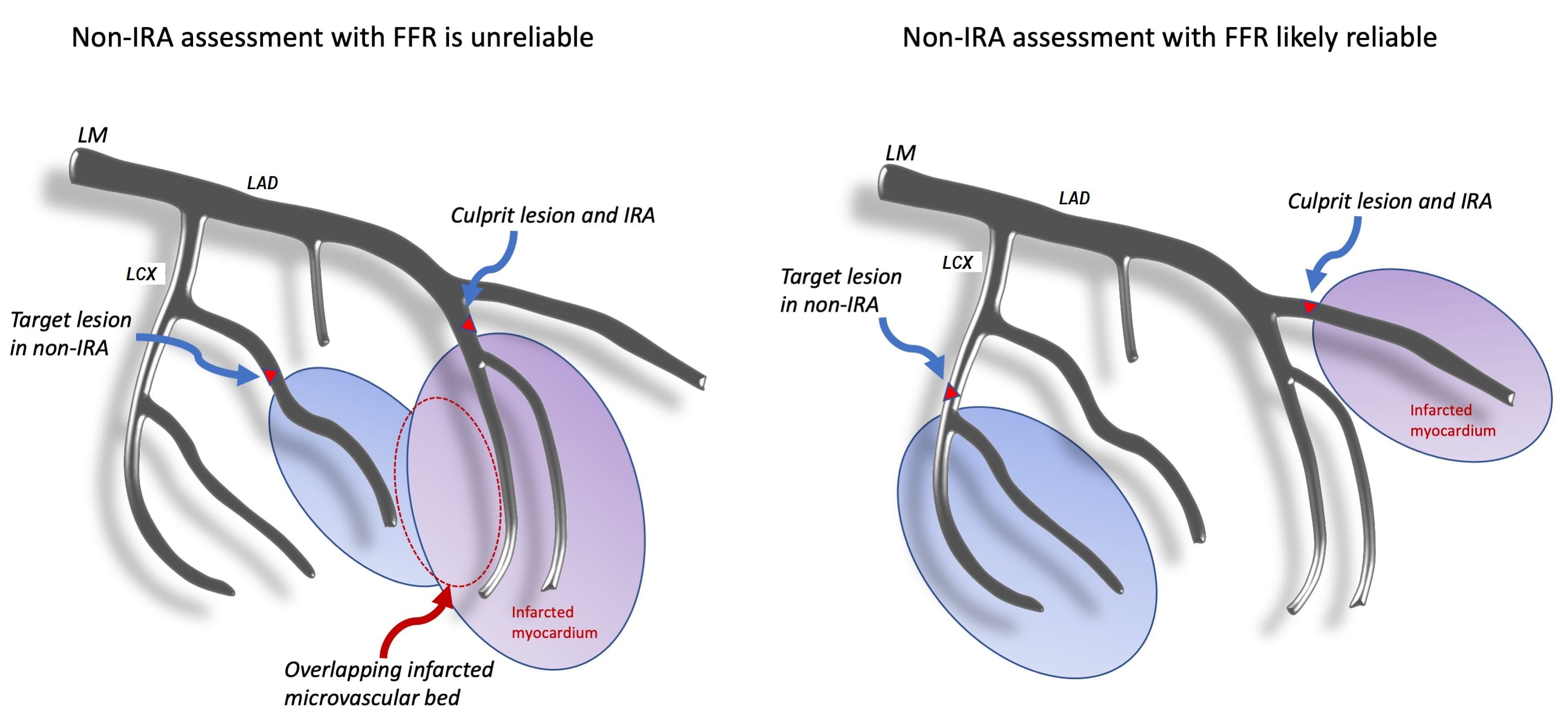 Fig. 1.Anatomic dependence of non-IRA assessment in acute coronary syndromes with zones of perfusion and infarcted myocardium. Overlapping infarcted microvascular bed represents a source of error in non-IRA FFR. Abbreviations: FFR, fractional flow reserve; LAD, left anterior descending coronary artery; LCx, left circumflex coronary artery; LM, left main coronary artery; IRA, infarct related artery; non-IRA, non-infarct related artery.