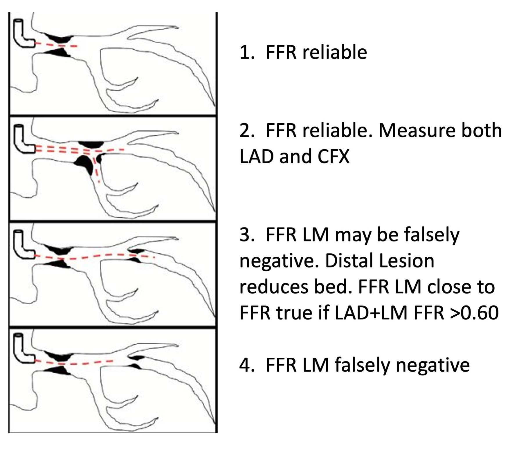 Fig. 2.FFR of left main stenosis with downstream disease. FFR is reliable in isolated LM disease and distal LM disease with ostial involvement when FFR is measured across both LAD and LCx. LM FFR may be falsely negative when FFR of LAD+LM together fall below 0.60 or when significant downstream disease is present but FFR is measured across only the LM lesion. Abbreviations: FFR, fractional flow reserve; LAD, left anterior descending coronary artery; LCx, left circumflex coronary artery; LM, left main coronary artery.