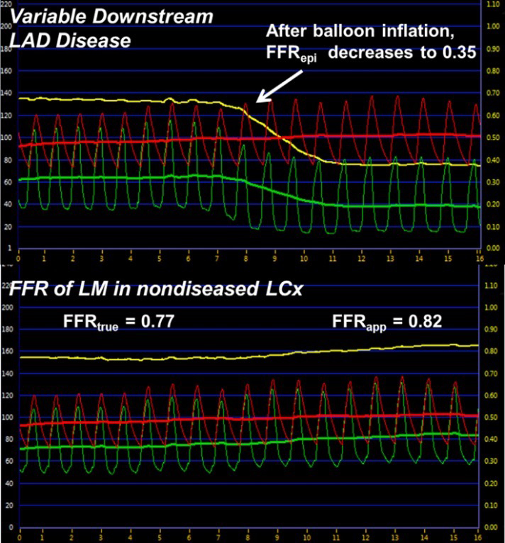 Physiology is often favored for assessment of simple, isolated LM stenosis or distal LM bifurcation stenosis which can be easily assessed with two FFR/NHPR measurements, one in the LAD and another with the pressure wire in the CFX. However, interpreting the LM FFR in the presence of significant downstream branch lesions is more complicated because the LM and LAD/CFX lesions behave like serial lesions. The true flow across the LM is potentially reduced by a severe downstream stenosis, artifactually elevating the LM FFR when measured in the unobstructed vessel.