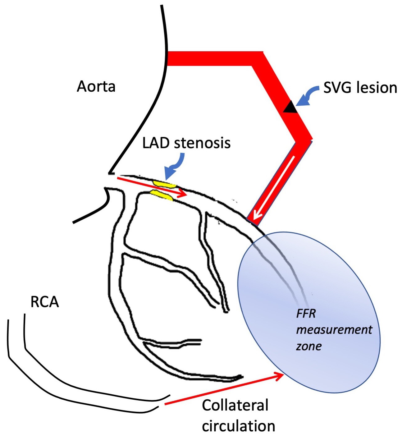 Fig. 4.Multiple sources of flow in the assessment of saphenous vein grafts. FFR measured distal to the SVG attachment site reflects flow from the SVG graft, the native vessel and any collateral circulation that has formed and may be misleading in assessing the significance of SVG lesions. Abbreviations: FFR, fractional flow reserve; LAD, left anterior descending coronary artery; RCA, right coronary artery.