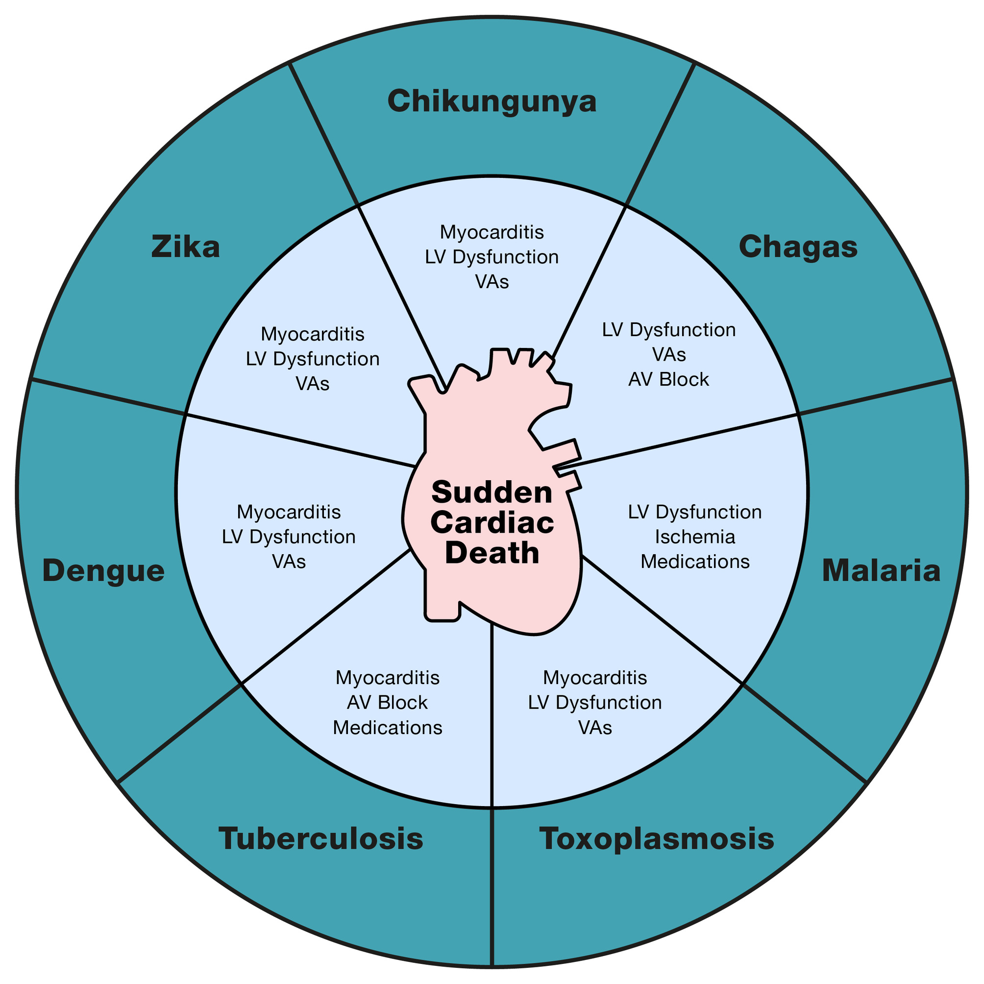 CV involvement in ZIKV disease includes pericarditis, myocarditis, arrhythmias, and HF which may lead to SCD (Fig. 2). Specifically, the virus invades the cell through tyrosine-protein kinase 3 and ICAM-3 receptors, prompting pro-inflammatory cytokine release. Subsequently, inflammatory or autoimmune damage triggers cellular apoptosis [15]. Myocarditis caused by ZIKV may only present as nonspecific chest pain or no symptoms at all and is usually undiagnosed. Thus, myocardial damage may go unnoticed. This can develop into HF, myocardial infarction, cardiogenic shock, and even SCD during the acute stage of infection [15, 62, 63].