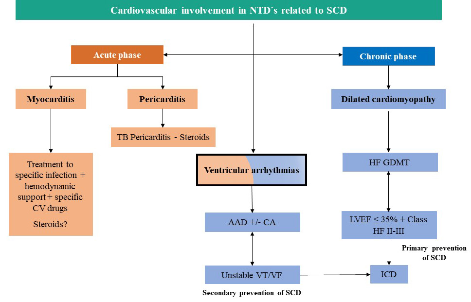 Fig. 3.General approach for specific therapies to prevent SCD in NTDs. AAD, antiarrhythmic drugs; CA, Catheter ablation; CV, cardiovascular; ICD, implantable cardioverter defibrillator; GDMT, guideline-directed management and therapy; HF, heart failure; LVEF, left ventricular ejection fraction; TB, tuberculosis; VT, ventricular tachycardia; VF, ventricular fibrillation.