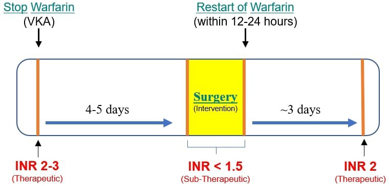 Fig. 1.Perioperative Warfarin therapy management. Discontinuing warfarin for 4–5 days reduces the INR below 1.5 which is safe for dental surgical intervention. After restarting warfarin, it takes around 3 days for INR to reach a therapeutic level of 2 before which there is an increased risk of thromboembolism.