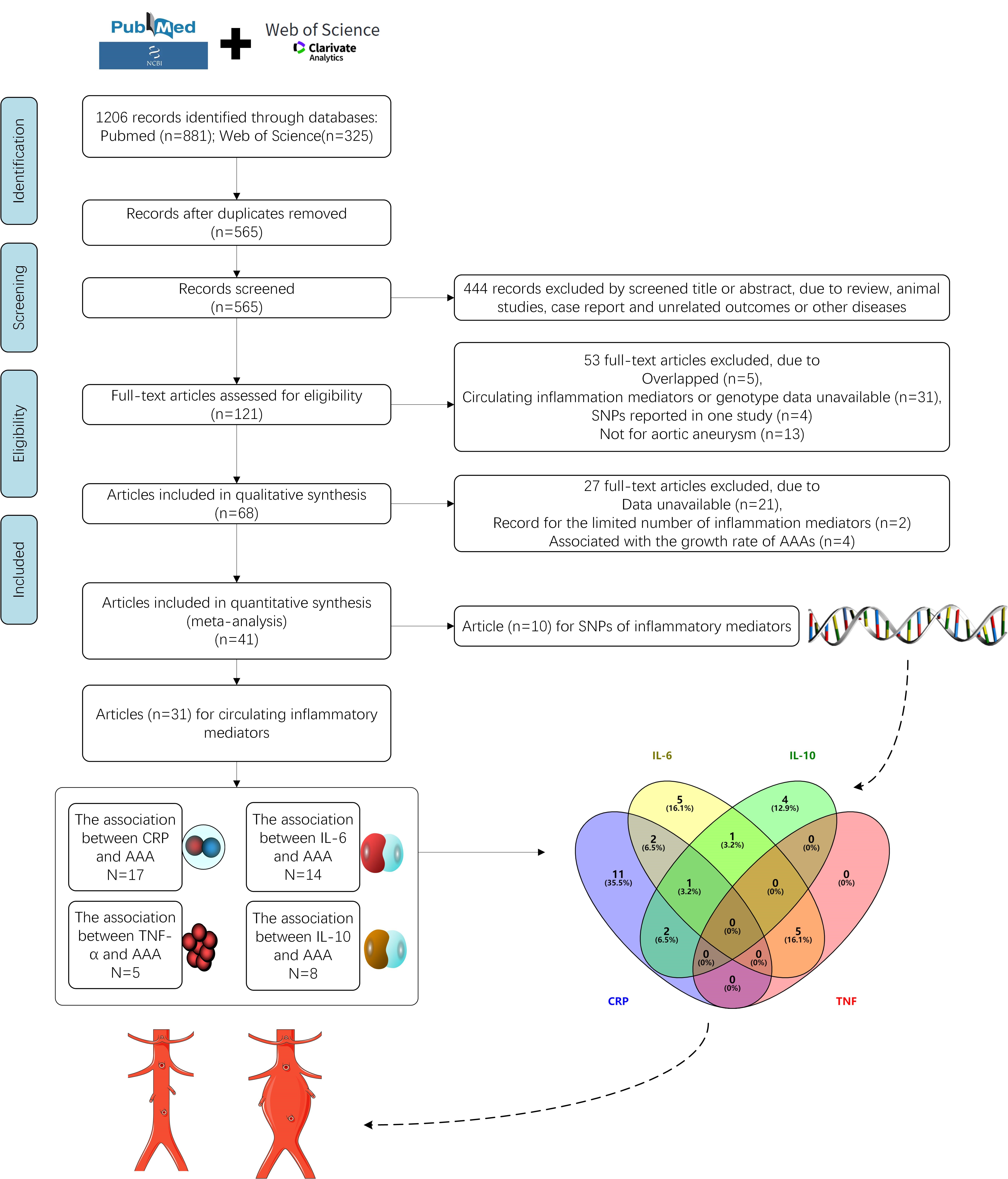 The study inclusion and exclusion flow chart of this systemic review and meta-analysis is presented in Fig. 1, which is in line with the PRISMA group. According to the search strategies, 121 relevant documents were preliminarily obtained after removing 444 duplicates. Post screening, 88 articles met the standard, and a total of 41 citations were determined. After full-text screening, 20 studies were found that reported the associations between CRP level/SNPs and AAA susceptibility, 17 mentioned the relations of IL-6 level/SNPs with AAA susceptibility, 7 reported the relationship between TNF-a level/SNPs and AAA susceptibility, and 10 mentioned the associations of IL-10 level/SNPs and AAA susceptibility.