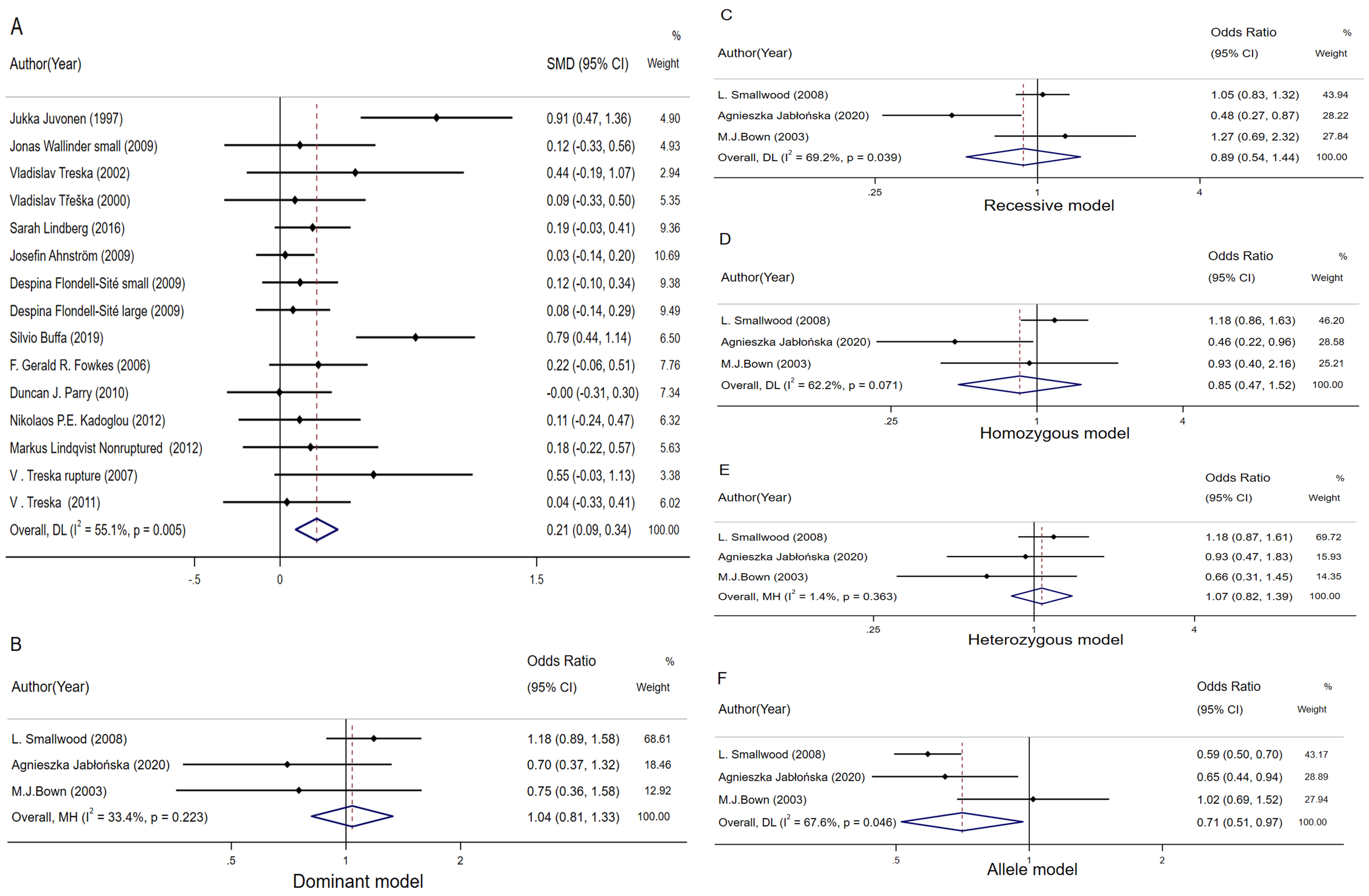 Fig. 4.The forest plot comparing the SMD and 95% CI association between circulating interleukin-6 levels and abdominal aortic aneurysm, and the OR and 95% CI association between rs1800795 and abdominal aortic aneurysm. (A) Meta-analysis of plasma IL-6 levels. (B) rs1800795 dominant gene model. (C) rs1800795 recessive gene model. (D) rs1800795 homozygous model. (E) rs1800795 heterozygous model. (F) rs1800795 allele gene model.