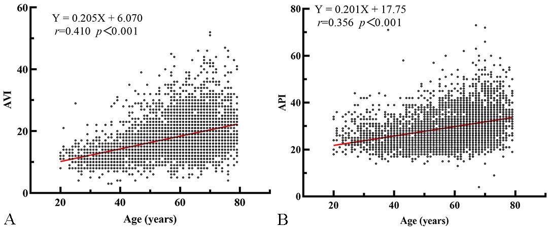 Fig. 1.Scatter plot and linear regression curve of AVI and API with age. (A) There is a significant positive correlation between age and AVI. (B) There is a significant positive correlation between age and API.