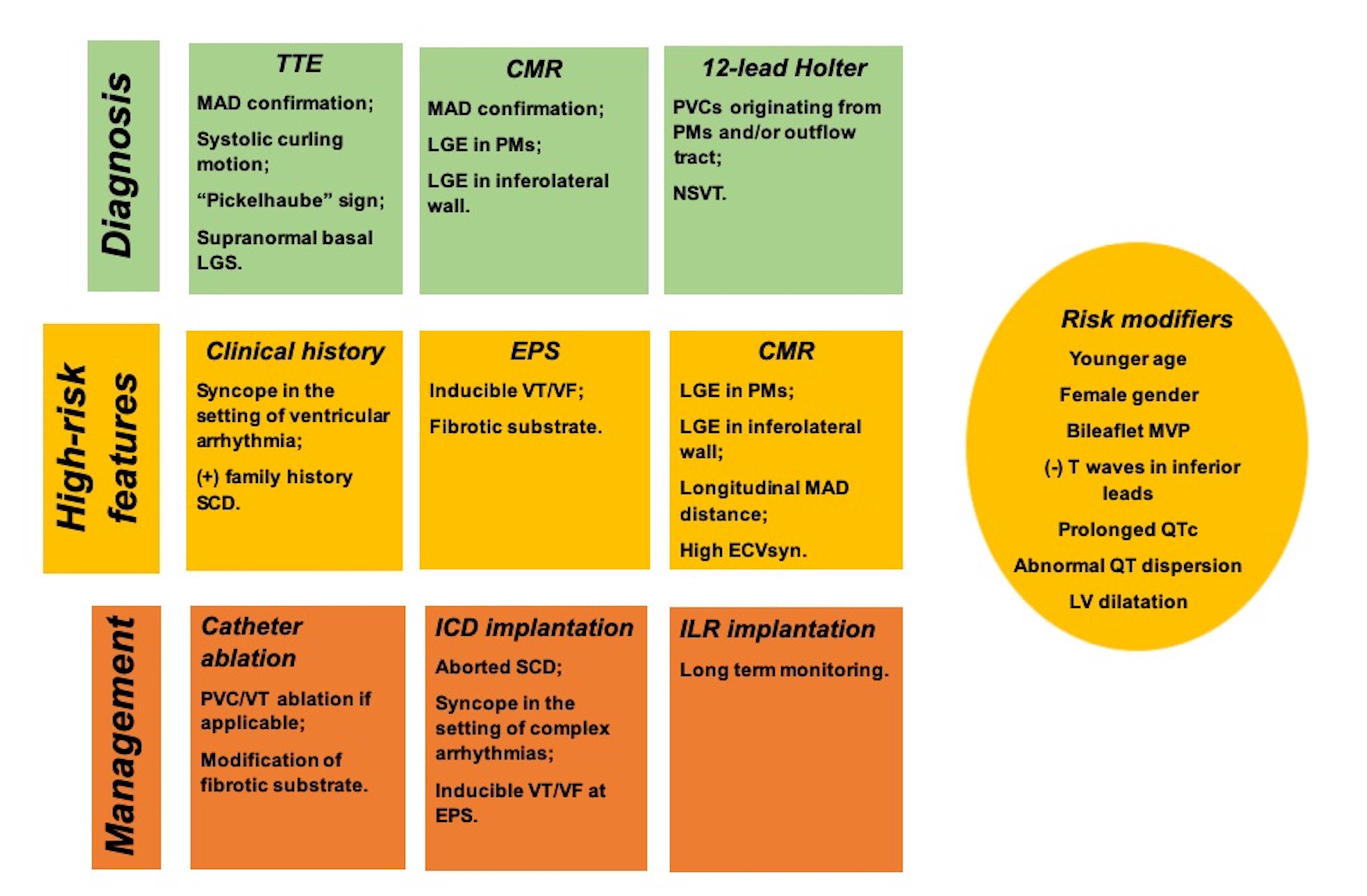 Fig. 4.Diagnosis, risk stratification and management of mitral annular disjunction (MAD) arrhythmic syndrome. Abbreviations: CMR, cardiac magnetic resonance imaging; EPS, electrophysiological study; GLS, global longitudinal strain; ICD, implantable cardioverter defibrillator; ILR, implantable loop recorder; LV, left ventricle; LGE, late gadolinium enhancement; MVP, mitral valve prolapse; NSVT, non-sustained VT; PVC, premature ventricular complex; QTc, corrected QT interval; SCD, sudden cardiac death; TTE, transthoracic echocardiography; VT/VF, ventricular tachycardia/ventricular fibrillation.