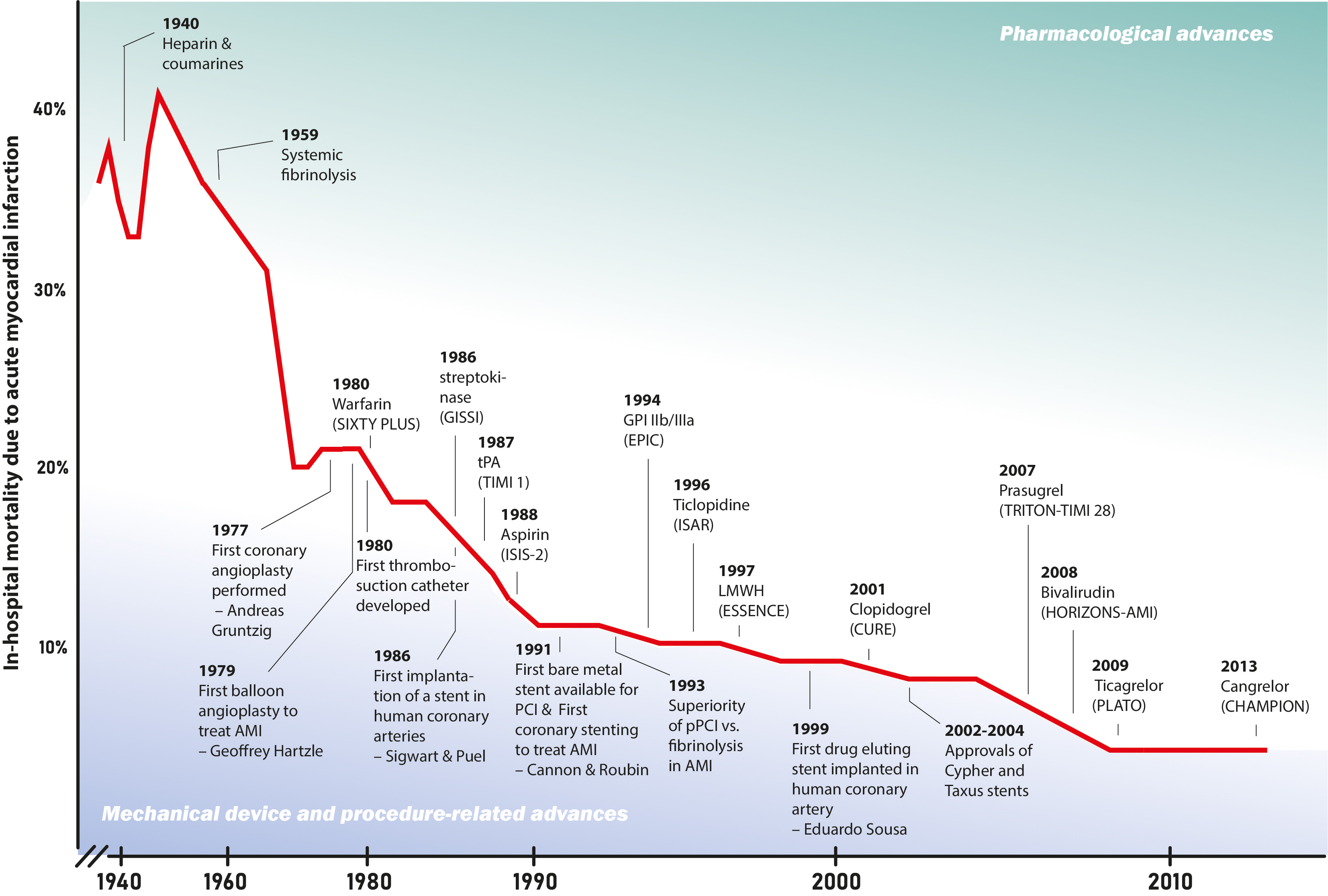 Fig. 1.Decline in in-hospital mortalitiy after acute myocardial infarction in relation to scientific advances. The timeline desplays the decline of in-hospital mortality after acute myocardial infarction over the last century, along with major advances in reperfusion therapy including inovations in pharmacotherapy, and in procedure and medical devices [1, 2, 3, 4, 5, 6]. CHAMPION, Cangrelor Versus Standard Therapy to Achieve Optimal Management of Platelet Inhibition; CURE, Clopidogrel in Unstable Angina to Prevent Recurrent Events; ESSENCE trial, Efficacy and Safety of Subcutaneous Enoxaparin versus intravenous unfractionated heparin in non–Q-wave Coronary Events; EPIC, Evaluation of 7E3 for the Prevention of Ischemic Complications Study; GISSI, Italian Group for the Study of Streptokinase in Myocardial Infarction; GPI, glycoprotein inhibitor; HORIZONS-AMI, Harmonizing Outcomes With Revascularization and Stents in Acute Myocardial Infarction; ISAR, The Intracoronary Stenting and Antithrombotic Regimen trial; ISIS-2, Second International Study of Infarct Survival; LMWH, low molecular weight heparin; PCI, percutaneous coronary intervention; PLATO, Platelet Inhibition and Patient Outcomes; SIXTY PLUS, Sixty Plus Reinfarction Study; TIMI 1, Thrombolysis in Myocardial Infarction 1; TRITON-TIMI 38, Trial to Assess Improvement in Therapeutic Outcomes by Optimizing Platelet Inhibition with Prasugrel–Thrombolysis in Myocardial Infarction.