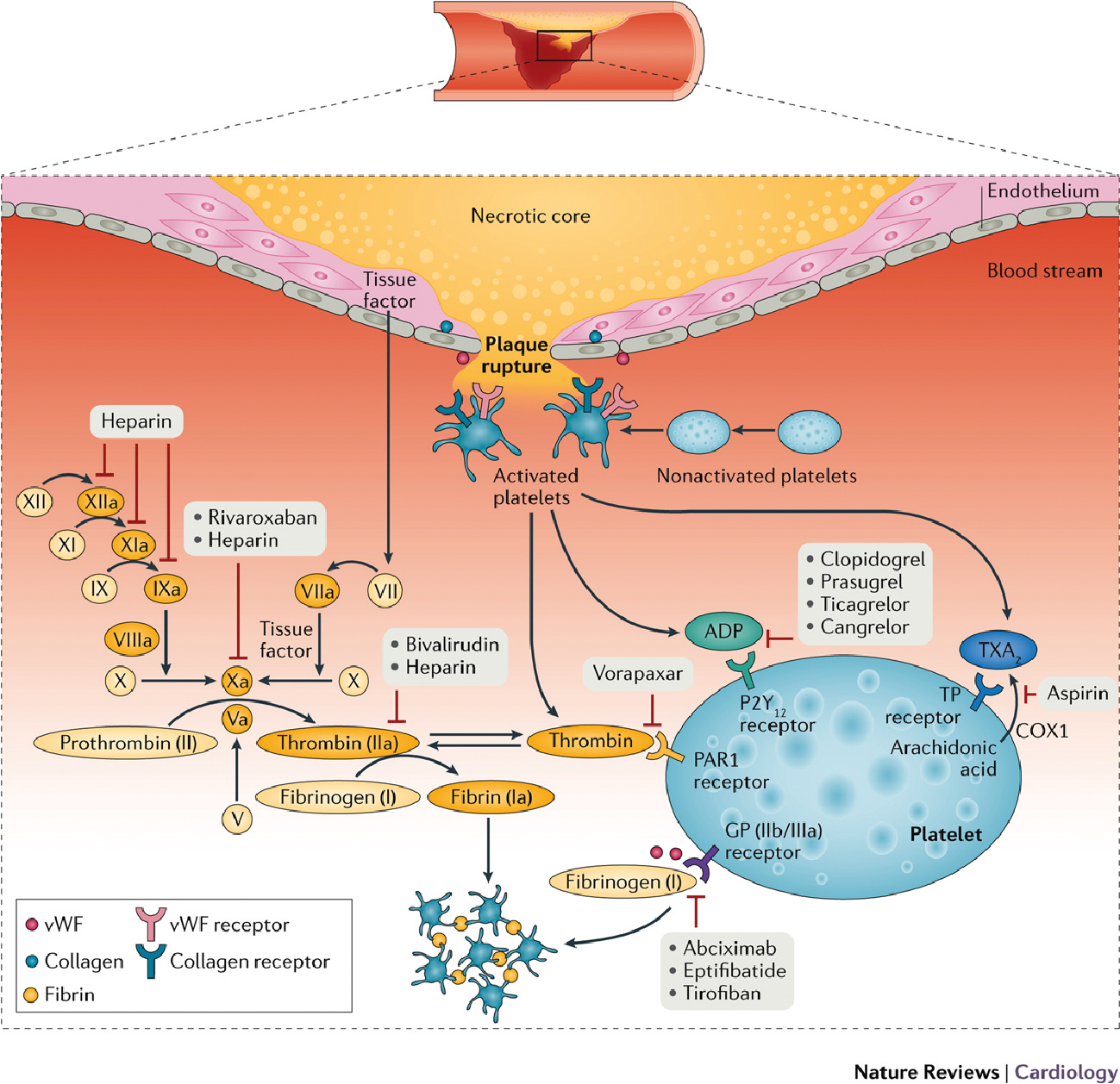 Fig. 2.Mechanism of thrombus formation during ST-segment elevation myocardial infarction, and targets of currently available antithrombotic agents. After plaque rupture, adhesion of platelets to the subendothelium during the rolling phase is mediated by the interaction between the glycoprotein (GP) Ib/V/IX receptor complex located on the platelet surface and von Willebrand factor (vWF), and between collagen exposed at the site of vascular injury and platelet collagen receptors. Binding of collagen to these receptors triggers intracellular mechanisms that induce the release of activating factors, mainly thromboxane A2 (TXA2), ADP, and thrombin. These factors enhance the interactions among adherent platelets and promote further recruitment and activation of circulating platelets. Platelet activation by these mediators has as the final pathway the conversion of the platelet GP IIb/IIIa receptor, the main receptor mediating platelet aggregation, into its active form. Activated GP IIb/IIIa receptors bind to fibrinogen and vWF, leading to platelet aggregation and thrombus formation mediated by platelet–platelet interactions. Vascular injury also exposes subendothelial tissue factor, which forms a complex with factor VIIa and sets off a chain of events that culminates in formation of the prothrombinase complex. Prothrombin is converted to thrombin, which subsequently converts fibrinogen to fibrin, generating a fibrin-rich clot, and further activates platelets by binding to protease-activated receptors (PAR1) on the platelet membrane. However, only a modest amount of thrombin is produced as a result of the coagulation cascade, and the surface of activated platelets is the main source of circulating thrombin. Antiplatelet and anticoagulant agents work by inhibiting key receptors and factors involved in this cascade of events. COX, cyclooxygenase; TP, thromboxane prostanoid. Reproduced from Franchi, F. et al. (2017) with permission from the authors (Dominick J. Angiolillo) [42].