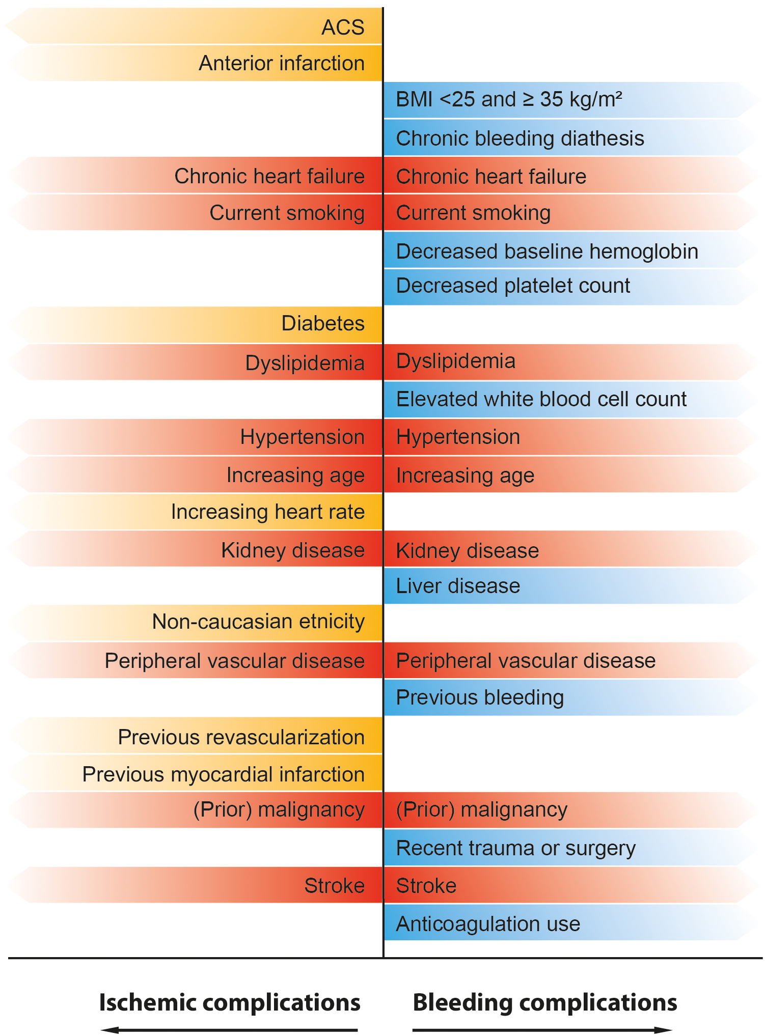 Fig. 3.Overview of previously identified predictors for ischemic and bleeding complications in patients with STEMI. Yellow labeled predictors are associated with an increased risk of ischemic complications. Blue labeled predictors are associated with an increased risk of bleeding complications. Red labeled predictors represent a high-risk patient group that is susceptible for both bleeding and ischemic complications [171, 172, 173].