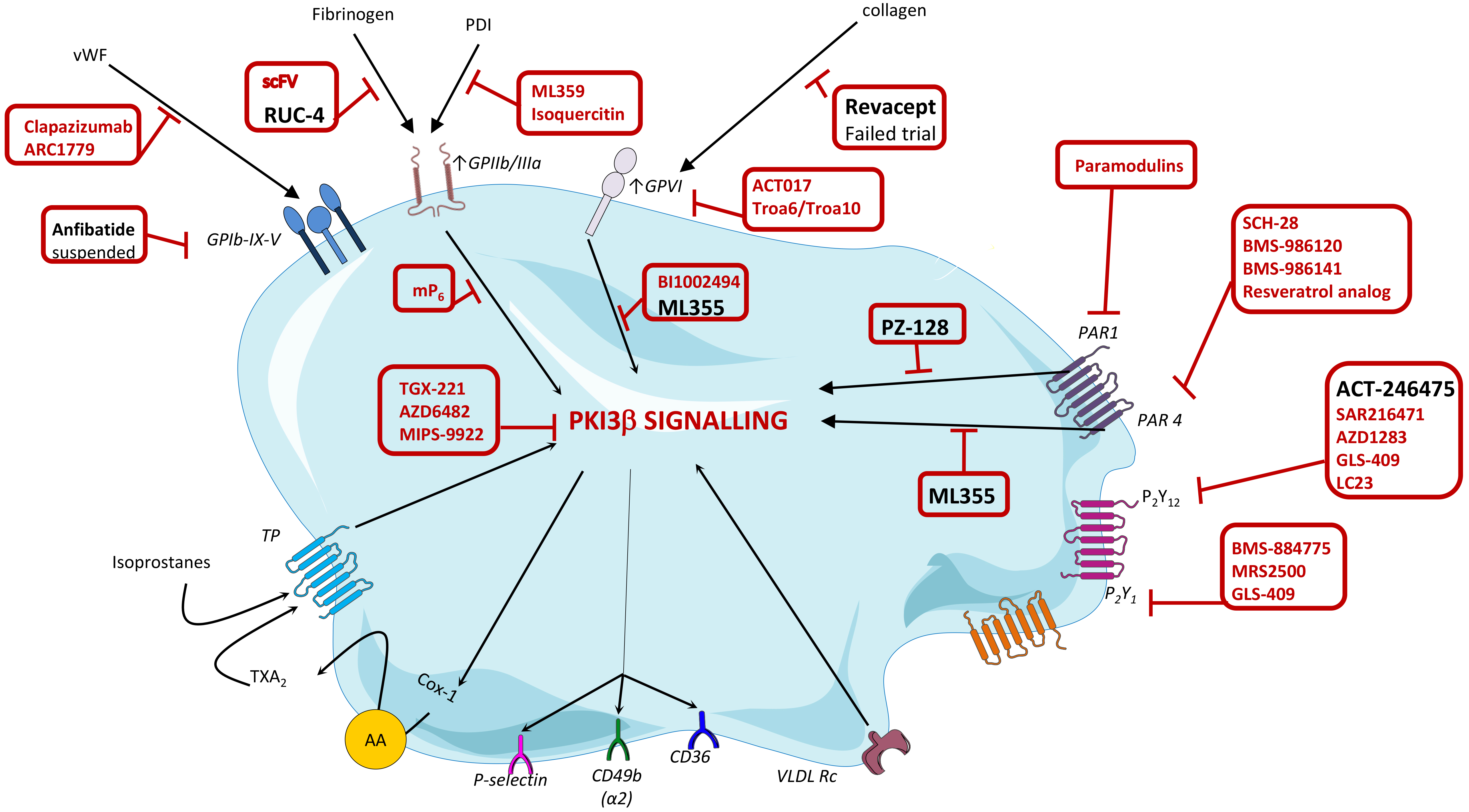 Fig. 4.Targets and novel platelet inhibitor molecules. Depicted in red
