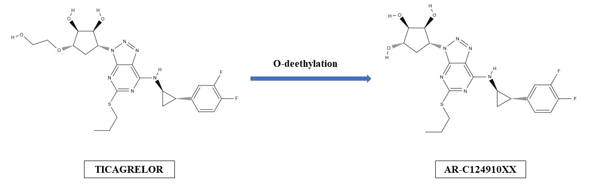 Hepatic formation of ticagrelor’s active metabolite (AR-C124910XX).