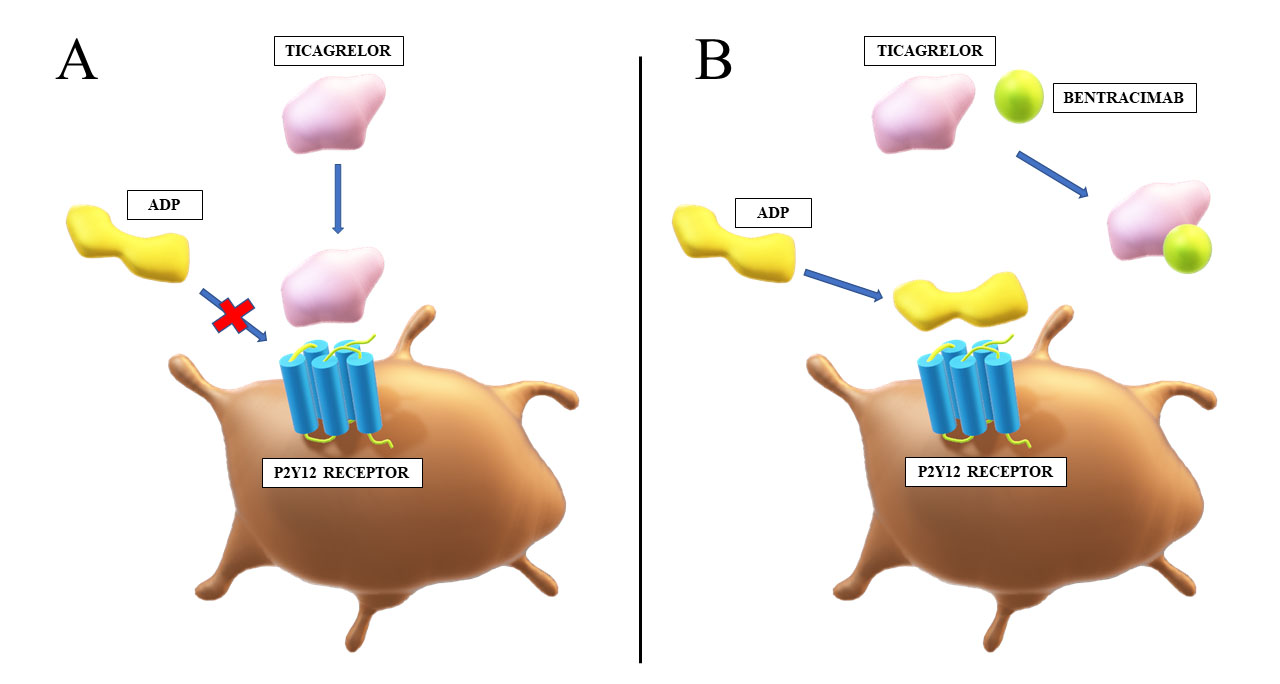 Mechanism of action of bentracimab. (A) Ticagrelor reversibly binds to the P2Y12 receptor and inhibits ADP-mediated activation of thrombocytes. (B) Bentracimab binds to ticagrelor with high affinity and specificity. This prevents inhibition of ADP signaling through the P2Y12 receptor by ticagrelor, which restores platelet activity. ADP, adenosine diphosphate.