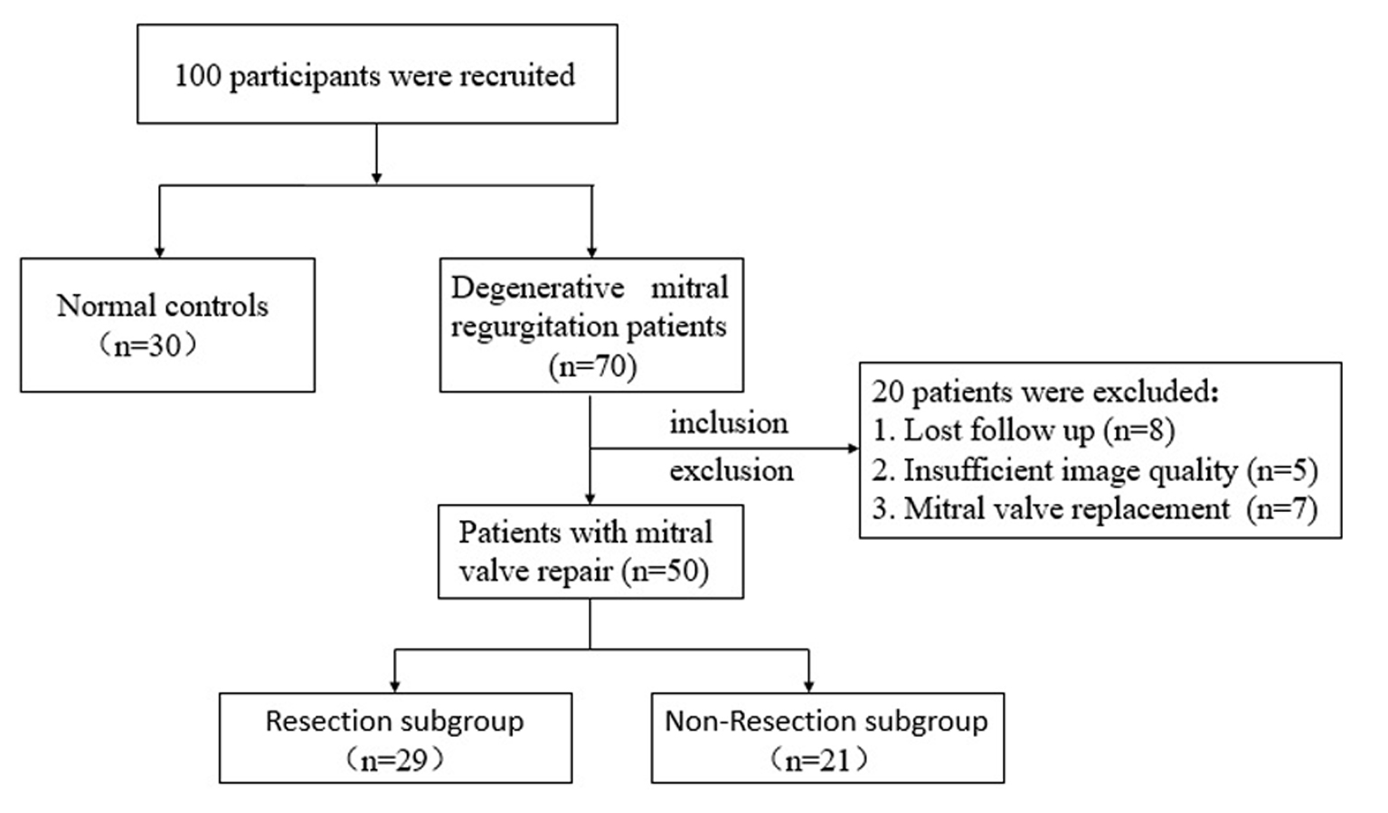 To compare patients with degenerative mitral regurgitation with controls of similar age and gender, 30 healthy volunteers were selected as control group during the same period. All included volunteers were confirmed to be free of abnormalities by physical examination, electrocardiogram, X-ray, echocardiography and laboratory tests in a physical examination center. Data on height, blood pressure and weight were collected.
