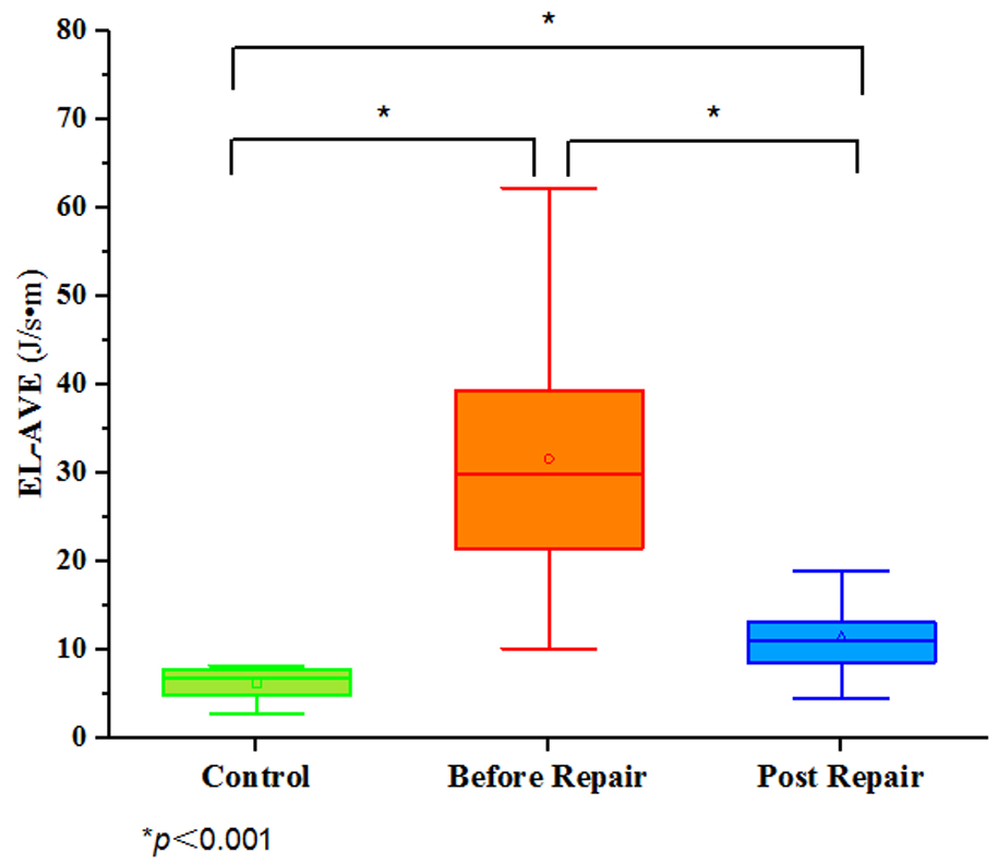 Fig. 3.EL-AVE in patients who underwent mitral valve repair and controls. EL-AVE of patients after mitral valve repair was higher than that of controls. EL-AVE, average energy loss.