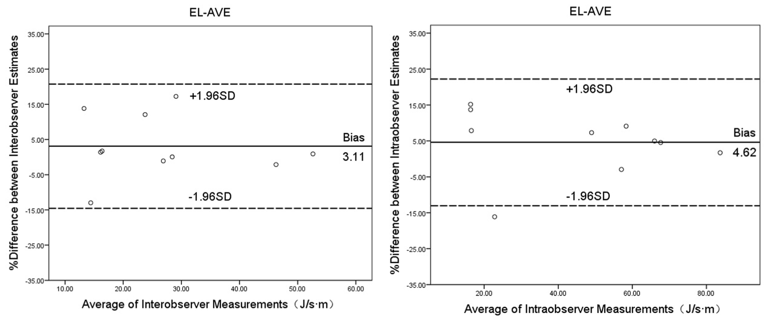 Ten random individuals were selected for evaluation of intraobserver and interobserver agreement on EL-AVE using Bland-Altman analysis.