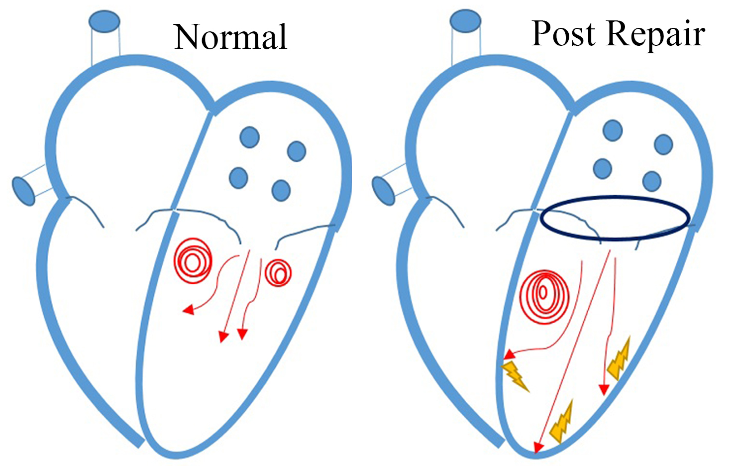 Fig. 6.Vortex change after mitral valve repair during diastole. Normal vortex patterns in a normal LV (left) and after mitral valve repair (right). Blood flow dissipated due to the collision of transmitral inflow on the ventricular wall after mitral valve repair.