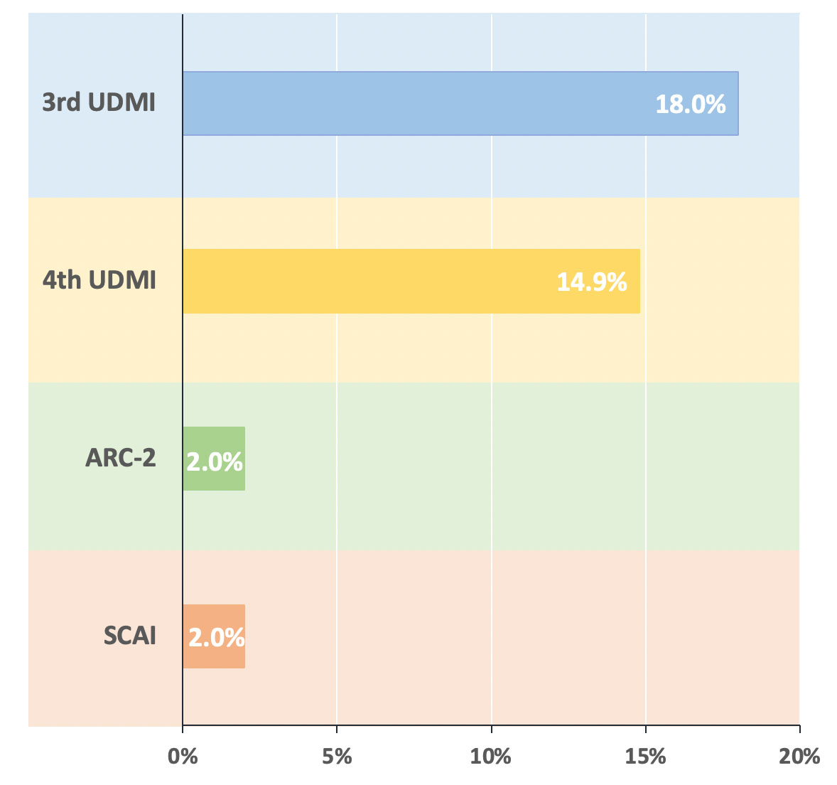Fig. 2.Different rates of periprocedural myocardial infarction in chronic coronary syndromes patients undergoing PCI according to the various definitions used. Abbreviations: UDMI, universal definition of myocardial infarction; ARC-2, Academic Research Consortium-2; SCAI, Society for Cardiac Angiography and Interventions.