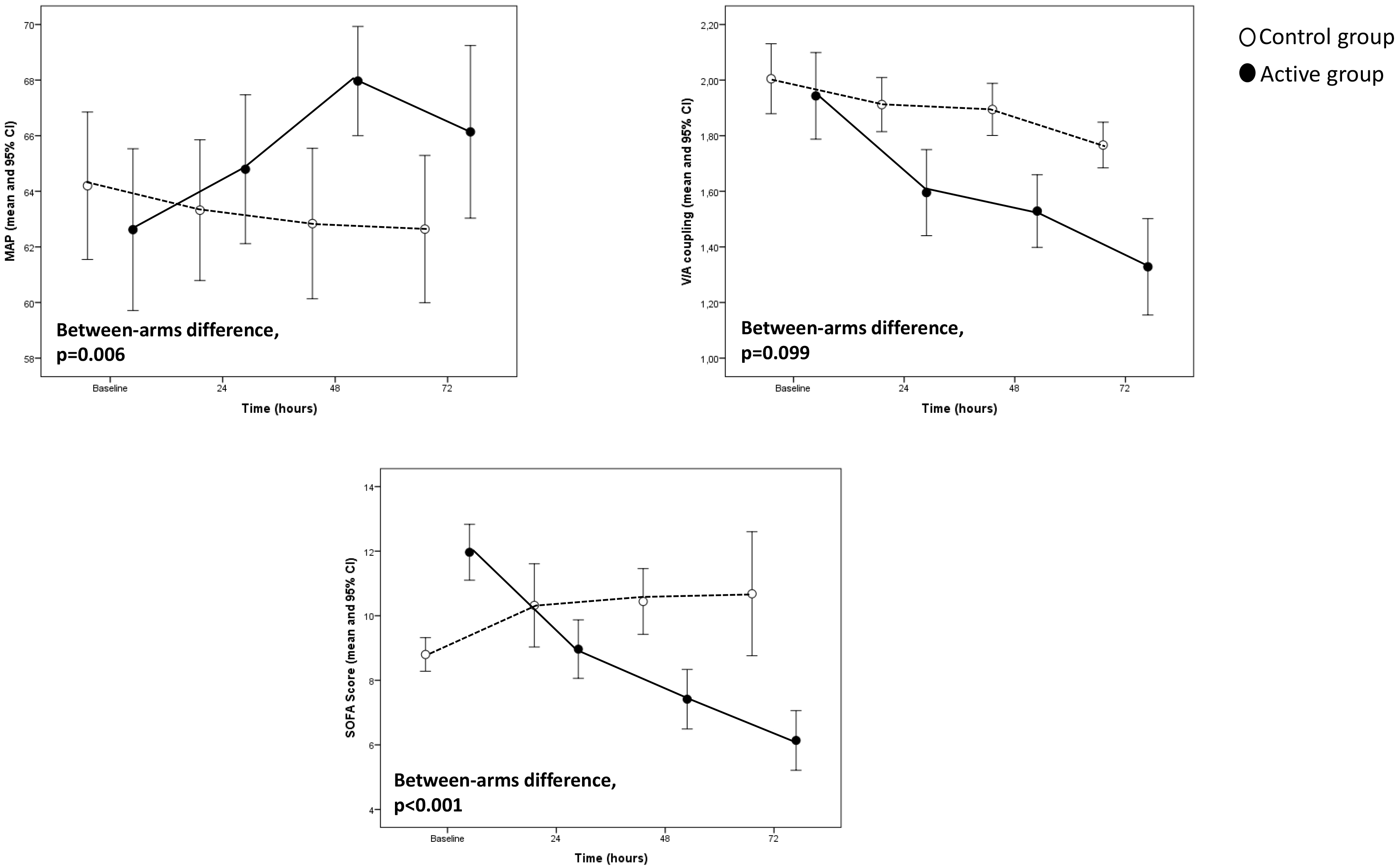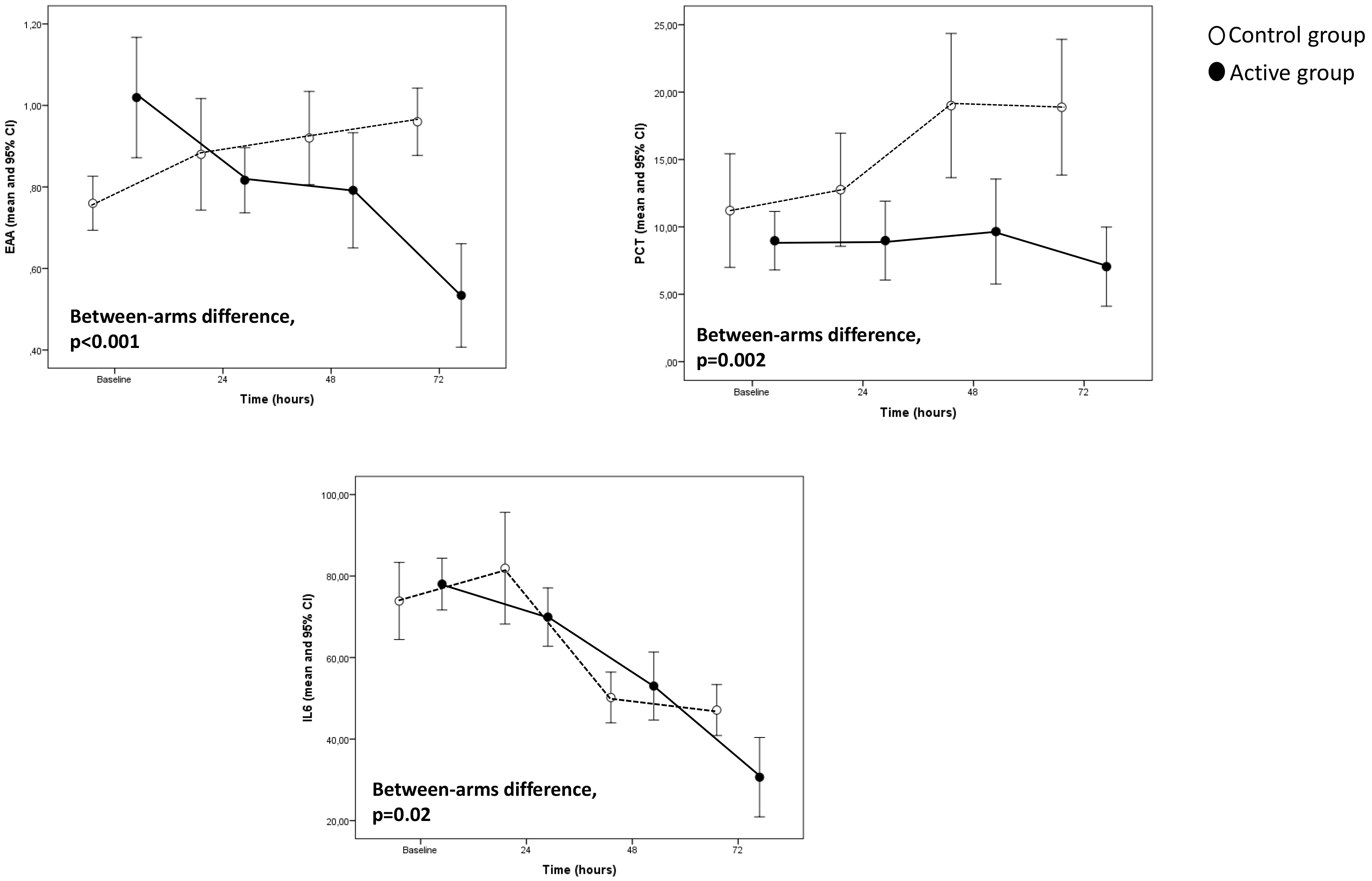 Continuous variables were reported as median and interquartile range [IQR]. 25th–75th quartiles range (IQR). Categorical variables were expressed as absolute number (N) and percentage (%). As appropriate, between groups, comparisons were performed by independent T-Test, Mann-Whitney Test, or Chi-Square Test. The relationship between the two variables was assessed by calculating the Pearson product moment correlation coefficient (r) and p value. The effect of the allocation arm (active group versus control group) on the evolution over time of repeated measurements of biomarkers and the SOFA score was investigated by the Generalised Linear Model (GLM). In these models, data were adjusted for the corresponding baseline value of each variable. For descriptive purposes, the evolution of key variables over time was reported as mean and 95% CI. The Kaplan-Meier analysis and log-rank test carried out the time-to-death analysis. Data analysis was carried out by SPSS for Windows, version 22, IBM, Chicago, IL, USA.