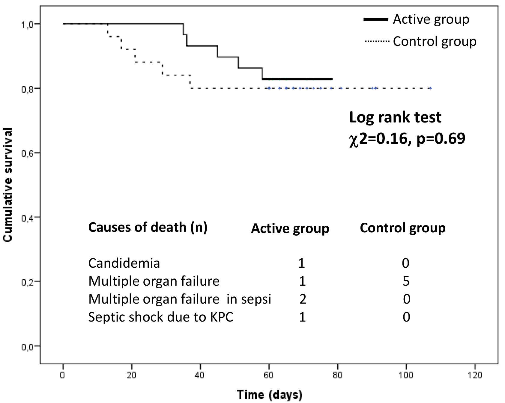 Fig. 4.Cumulative survival in the active group compared with the control group.