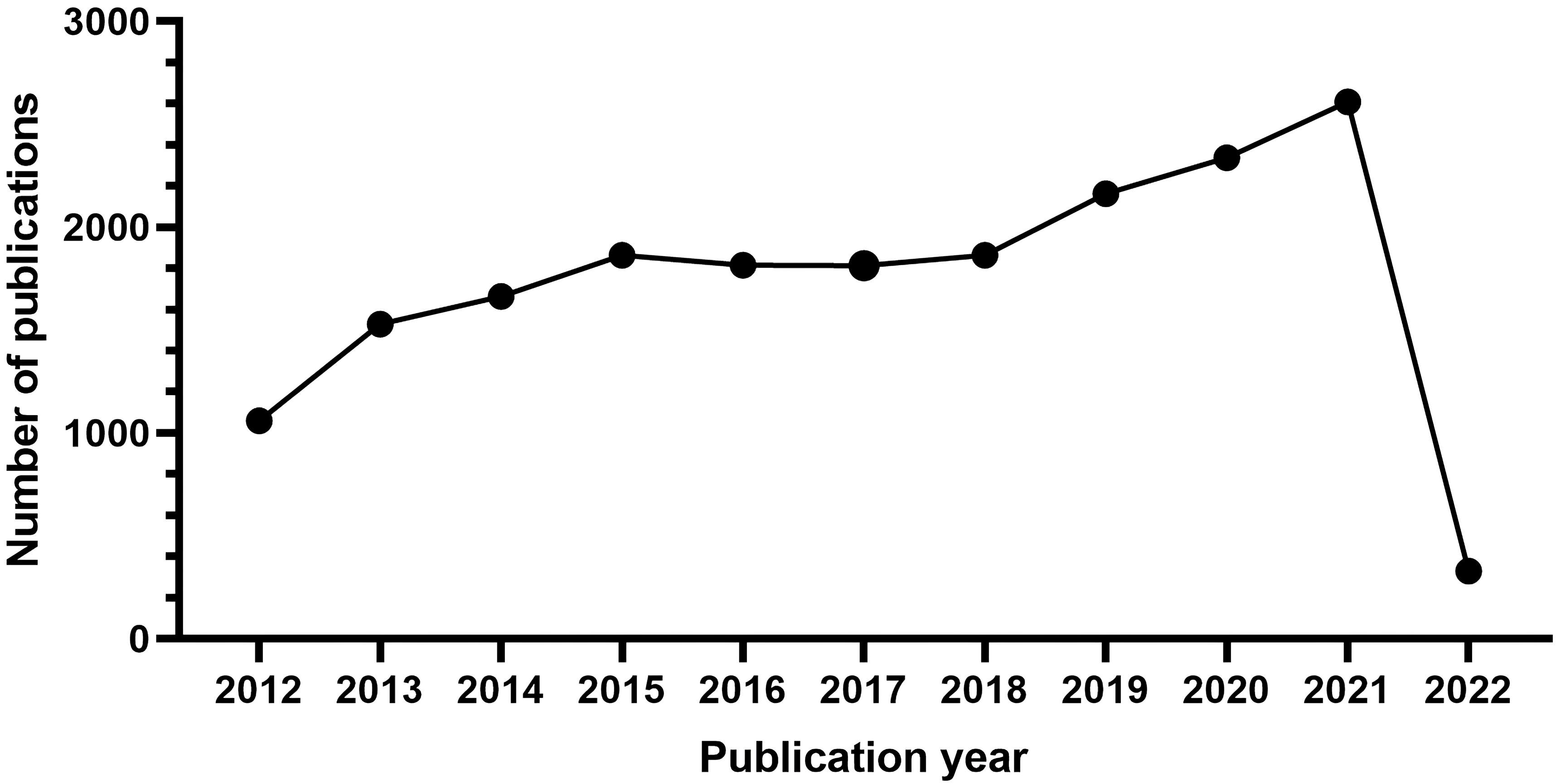 From 2012 to 2015, it was the initial period which showed a continuous upward trend, where the number of publications rose from 1061 to 1864. Growth was flat after 2015 and continued until 2018. During the third stage from 2019 through 2021, a period of rapid growth then occurred and the output reached the maximum in 2021 (2609).