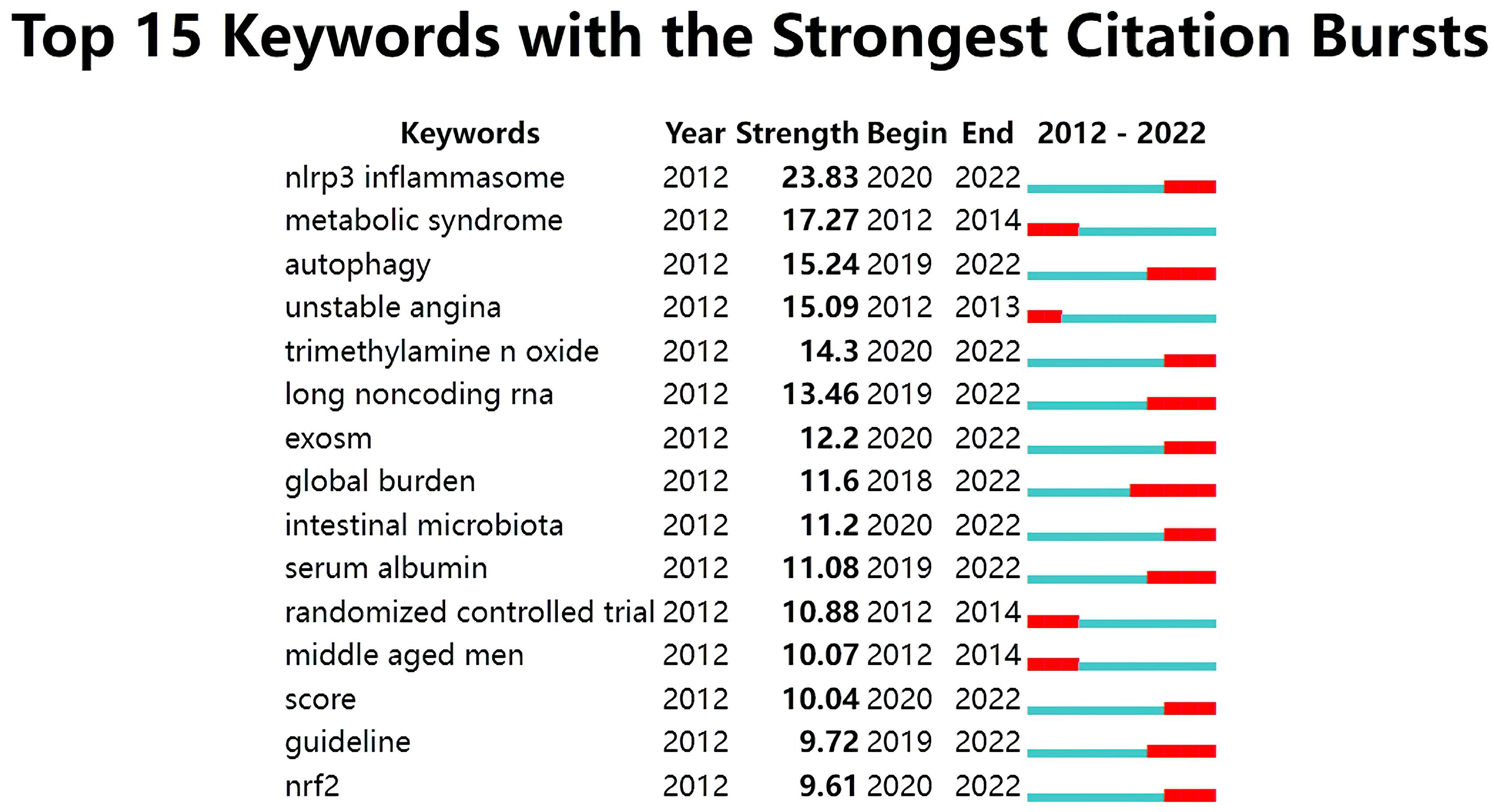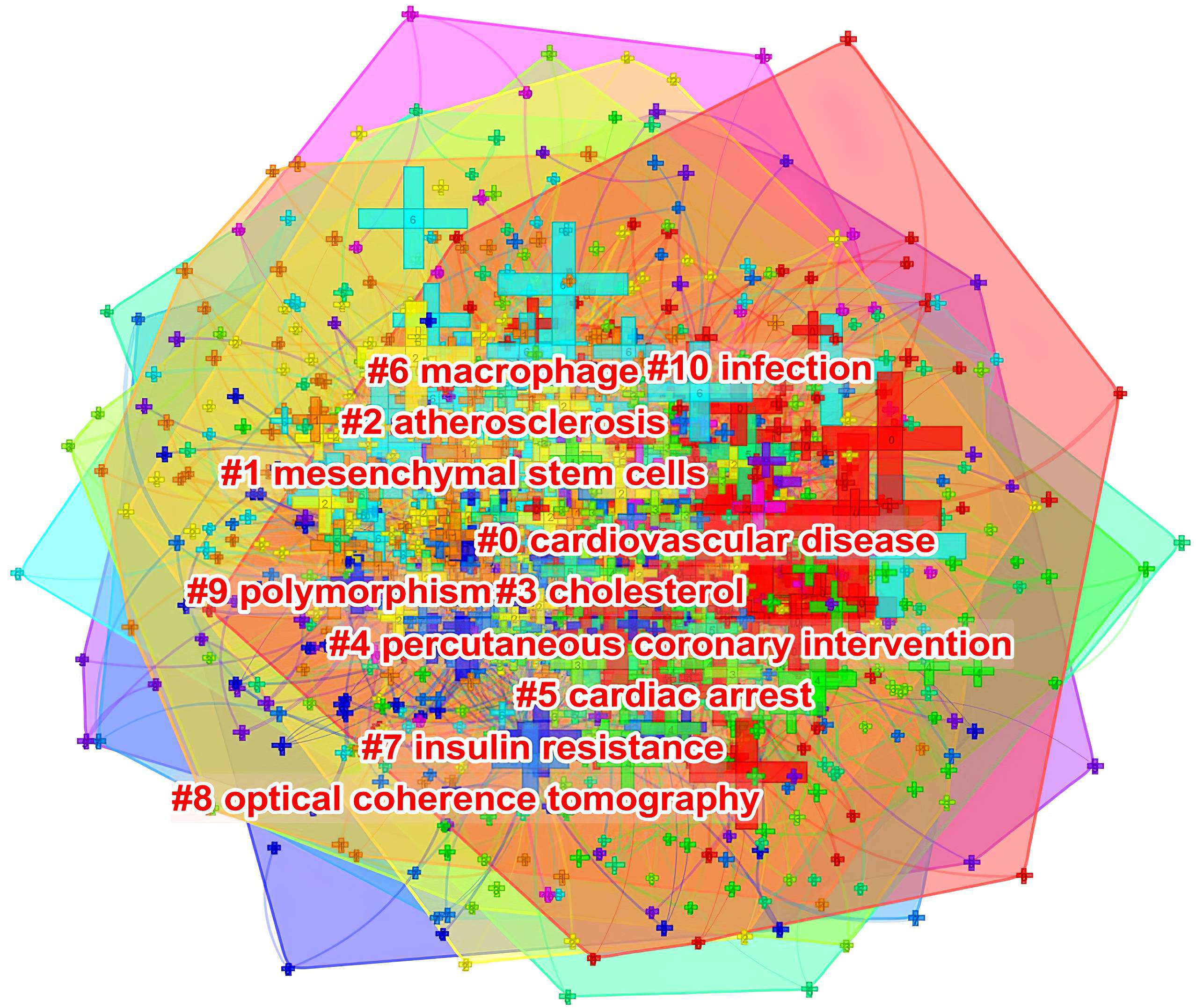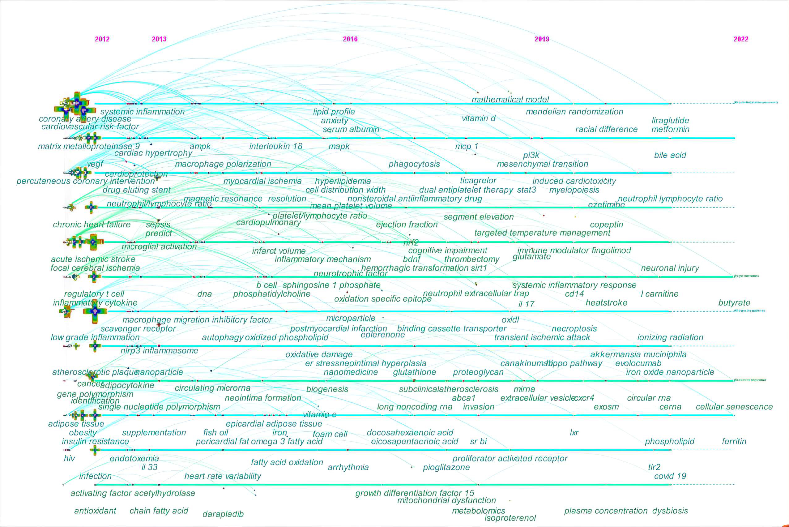 The search was performed using the Science Citation Index Expanded of the Web of Science Core Collection (WOSCC) of Clarivate Analytics on a single day. The following search strategy was used to identify relevant publications: (((TI=((“heart arrest”) OR (“sudden cardiac death”) OR (“cardiac arrest”) OR (“acute coronary syndrome*”) OR (angina*) OR (coronary NEAR/2 (disease* OR syndrome* OR occlus* OR reocclus* OR re-occlus* OR steno* OR restenos* OR obstruct* OR lesio* OR block* OR harden* OR stiffen* OR obliter* OR thromo*)) OR ((heart OR cardiac OR myocardial) NEAR/2 (isch?em* OR attack* OR infarct*)) OR (“cardiogenic shock”) OR (STEMI OR NonSTEMI OR Non-STEMI OR NSTEMI) OR (“myocardial reperfusion injury”) OR (“arterial occlusive disease*”) OR (arteriosclero* OR arteriolosclero* OR atherosclero*) OR (“peripheral arter* disease*” OR “cerebrovascular accident*”) OR (carotid stenosis) OR (“cerebral vascular disorder*” OR “cerebral vascular disease*” OR “cerebrovasc* disorder*” OR “cerebrovasc* disease*”) OR (((brain* OR cerebral OR lacunar) NEAR/2 (infarct* OR isch?em*)) OR stroke*) OR (brain NEAR/2 accident*) OR apoplexy OR ((intracranial OR intra-cranial) NEAR/2 (hemorrhage* OR emboli* OR thromo*)) OR (ASCVD OR “atherosclerotic CVD” OR “atherosclerotic cardiovascular disease*” OR “atherosclerotic cardio-vascular disease*”) OR (“myocardial revascularization”) OR (angioplast*) OR (“coronary atherectom*”) OR (“coronary artery” NEAR/2 (bypass OR by-pass OR anastomosis)) OR ((cardiac OR heart) NEAR/2 catheterization*) OR (PCI OR “percutaneous coronary intervention*” OR PTCA OR CABG))) AND TS=((inflam* OR “c reactive protein*” OR “acute-phase protein*” OR interleukin* OR “tumo$r necrosis factor*” OR cytokine* OR interferon* OR chemokine*))) AND DT=(Article)) AND LA=(English). The timespan for data retrieval was set from March 10, 2012 until March 10, 2022. The bibliometric information of the publications was collected and imported into CiteSpace and VOSviewer for analysis.