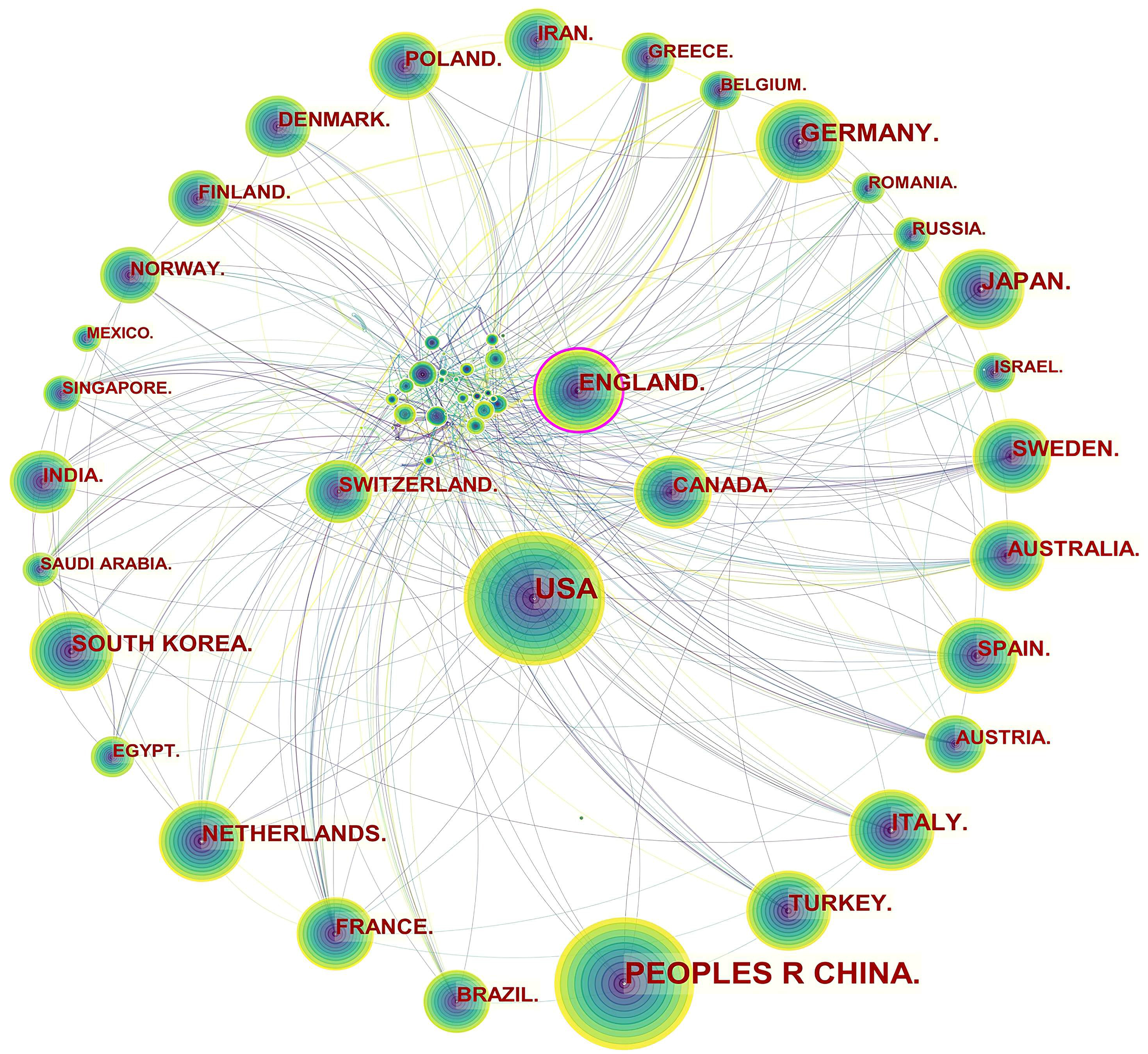 Specifically, three levels of scientific collaboration network analysis are presented, namely the micro-author, the meso-institutional, and the macro-national. In Fig. 2, each node represents a country or region, and the volume associated with each node corresponds to the number of publications it shares. There is a bidirectional relationship between the two countries as indicated by the connecting curve, and the thickness of the curve signifies the strength of the bidirectional cooperation. The nodes with a high betweenness centrality greater than 0.1 (e.g., those linked with over 10% of the nodes in the entire network) are identified by purple rings. The more connections an individual nation possesses, the greater its influence or betweenness centrality is in the network [81]. For example, the USA cooperated frequently with Canada, Mexico, Argentina, Colombia, Peru, Spain, South Korea, China, Thailand, Japan, Iran, Lebanon, Jordan, Australia, Ethiopia, and Uganda. England worked closely with the USA, Canada, Uruguay, Finland, Norway, Italy, Luxembourg, Hungary, Sweden, France, Denmark, Germany, Greece, the Netherlands, Czechia, Sweden, Switzerland, Romania, Serbia, Spain, Malaysia, Singapore, Iran, India, Pakistan, Malawi, South Africa, Nigeria, and Ghana.