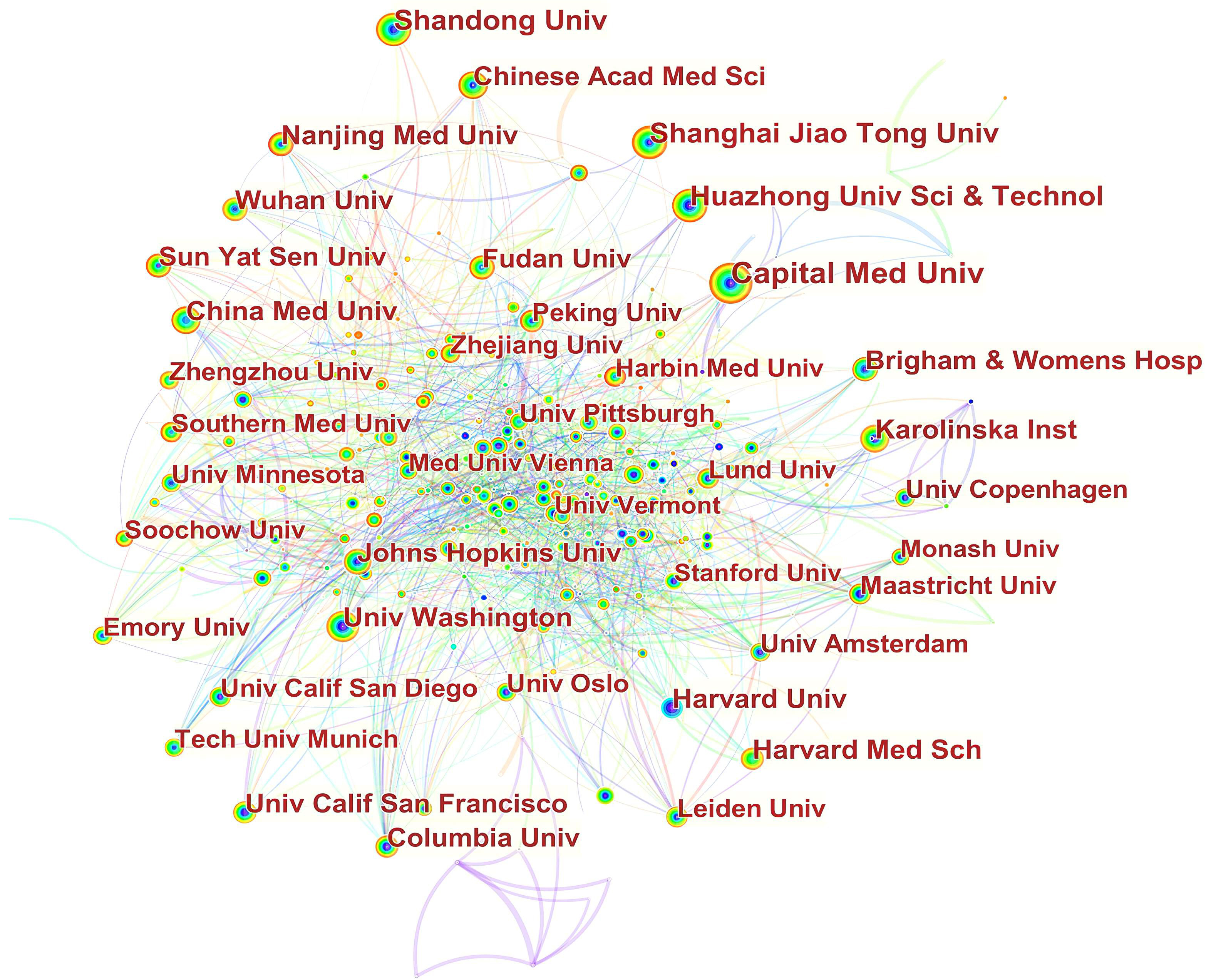 As for the analysis of institutions, the leading research organization for publications on this topic was Capital Med Univ (410, 2.15%), followed by Shanghai Jiao Tong Univ (295, 1.55%), and Huazhong Univ Sci & Technol (279, 1.46%).
