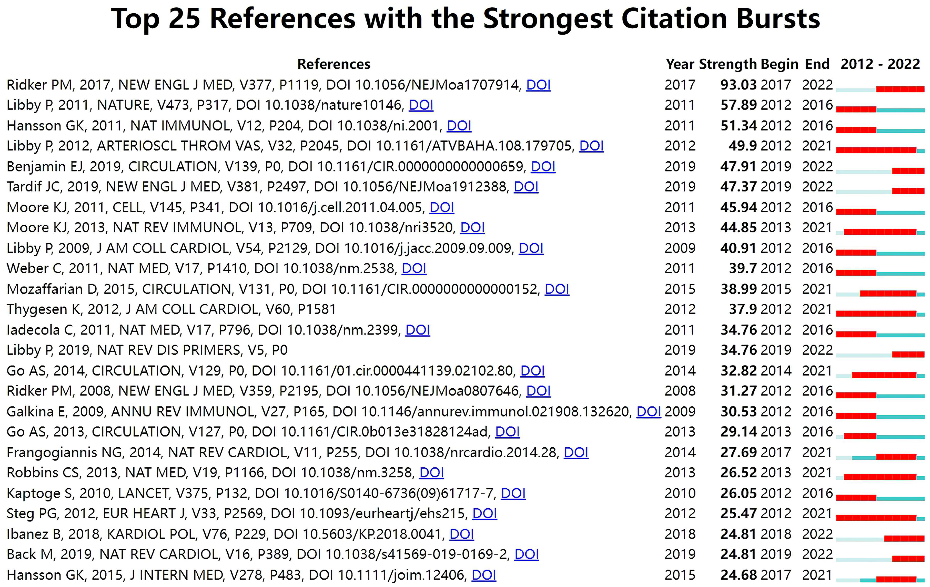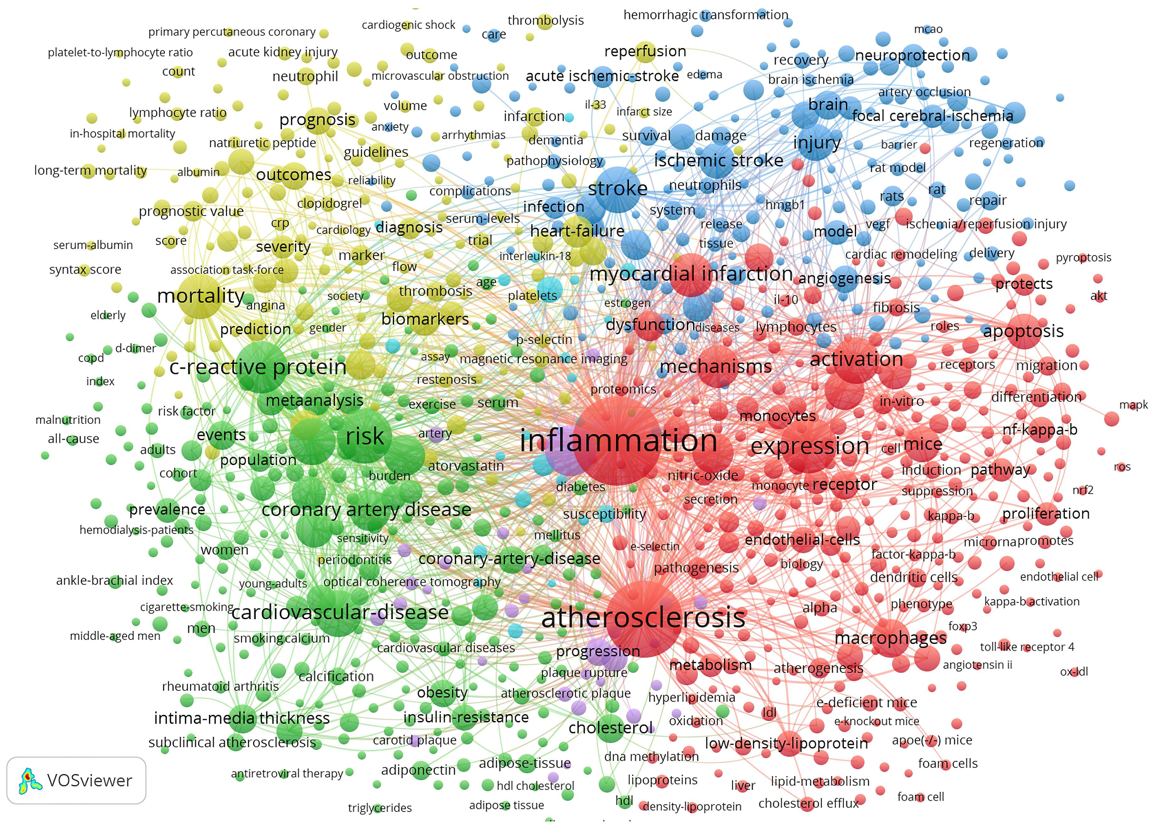 Due to inflammation as a final pathway of risk factors such as hypertension, diabetes, smoking, central obesity, and chronic immune-inflammatory diseases as well as an independent driver of atherogenesis [41, 74], there has been extensive investigation into the link between inflammation and ASCVD, resulting in an ongoing interest which is reflected by the growing number of papers published every year. However, the exponentially increasing volume of publications renders it impossible to identify high-impact research and to keep up to date with the latest findings. In this sense, there is an opportunity to respond to the demands with the bibliometric approaches, since they enable us to explore the structure, productivity, progress, quality, impact, and interconnection of scientific work in greater detail [75, 76].