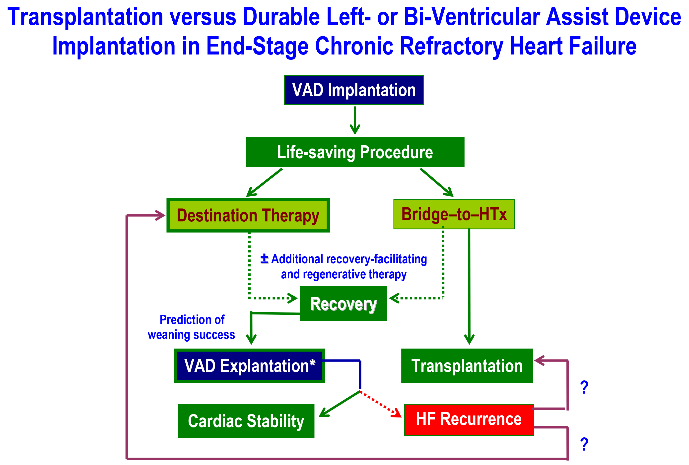 Fig. 1.Interconnections between long-term mechanical ventricular support and heart transplantation in the management of patients with end-stage heart failure. VAD, ventricular assist device; HF, heart failure. * explantation can be successful even after incomplete cardiac recovery [11]. ? indicates that in case of HF recurrence, there are these 2 alternatives (i.e., transplantation or implantation of a second VAD). Dotted arrows indicate lower probability.