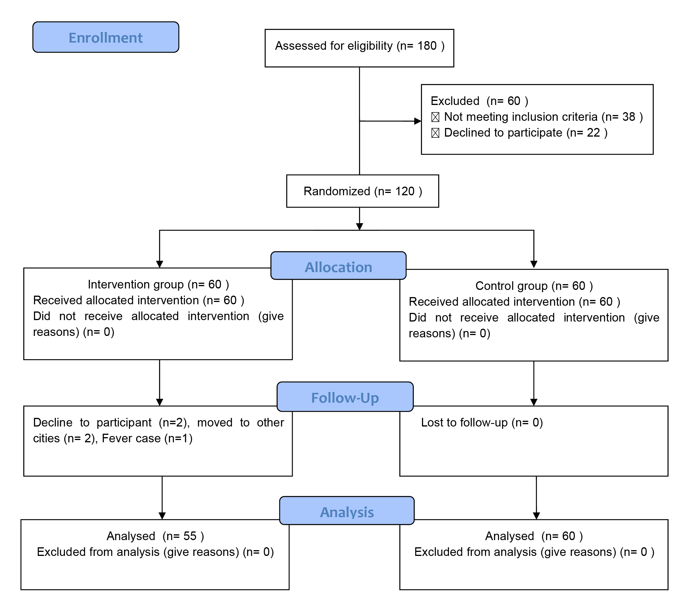 From May 2020 to Dec 2021, 180 participants were screened in this study, and 65 were excluded [not meeting inclusion criteria (n = 38), declined to participate (n = 22), declined to participate in the intervention group (n = 2), moved to other cities in the intervention group (n = 2), fever case in the intervention group (n = 1)]. Finally, 115 participants were included for data analysis (Fig. 1).