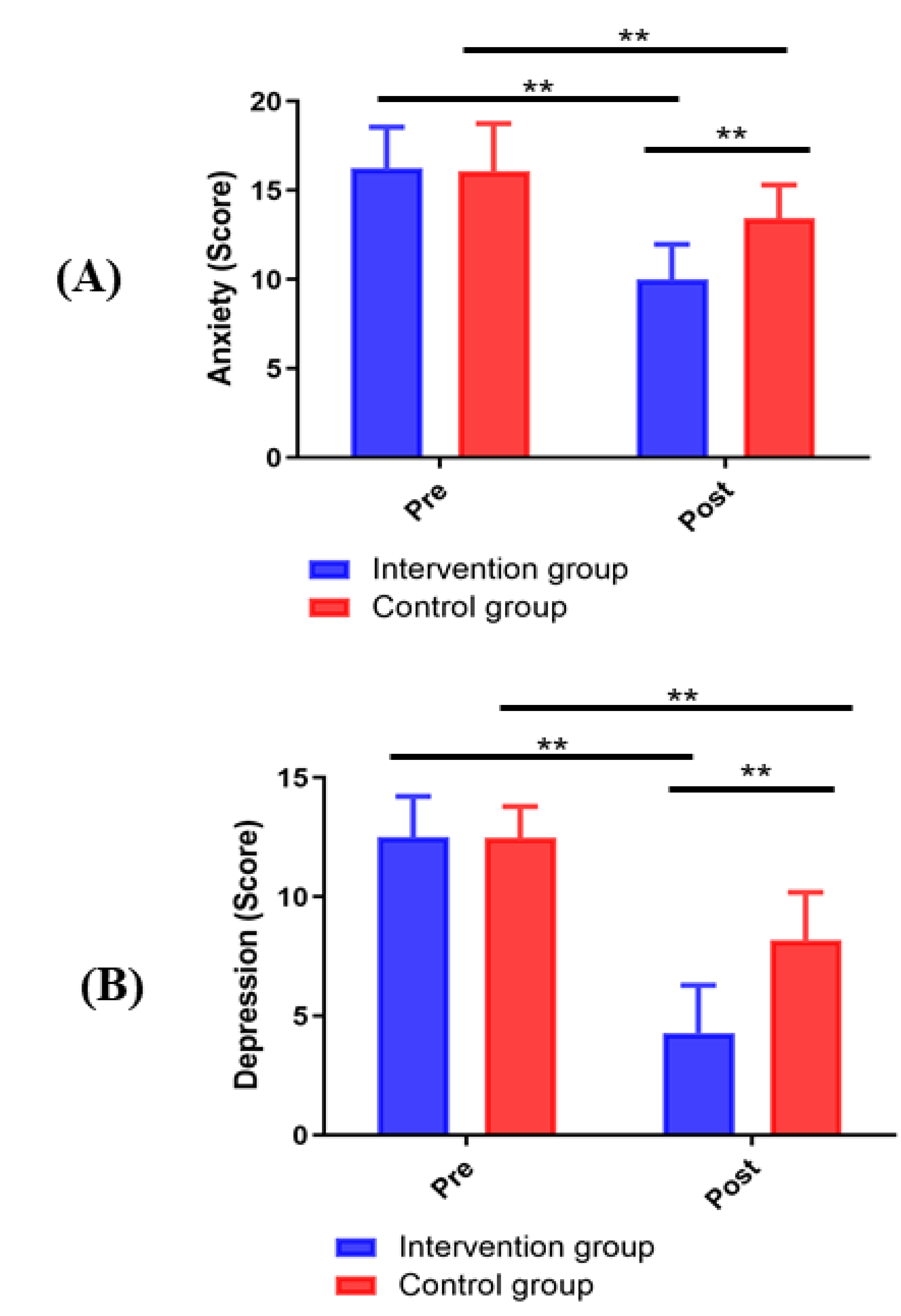 Fig. 7.Changes in HADS scores between groups. (A) Anxiety. (B) Depression.
