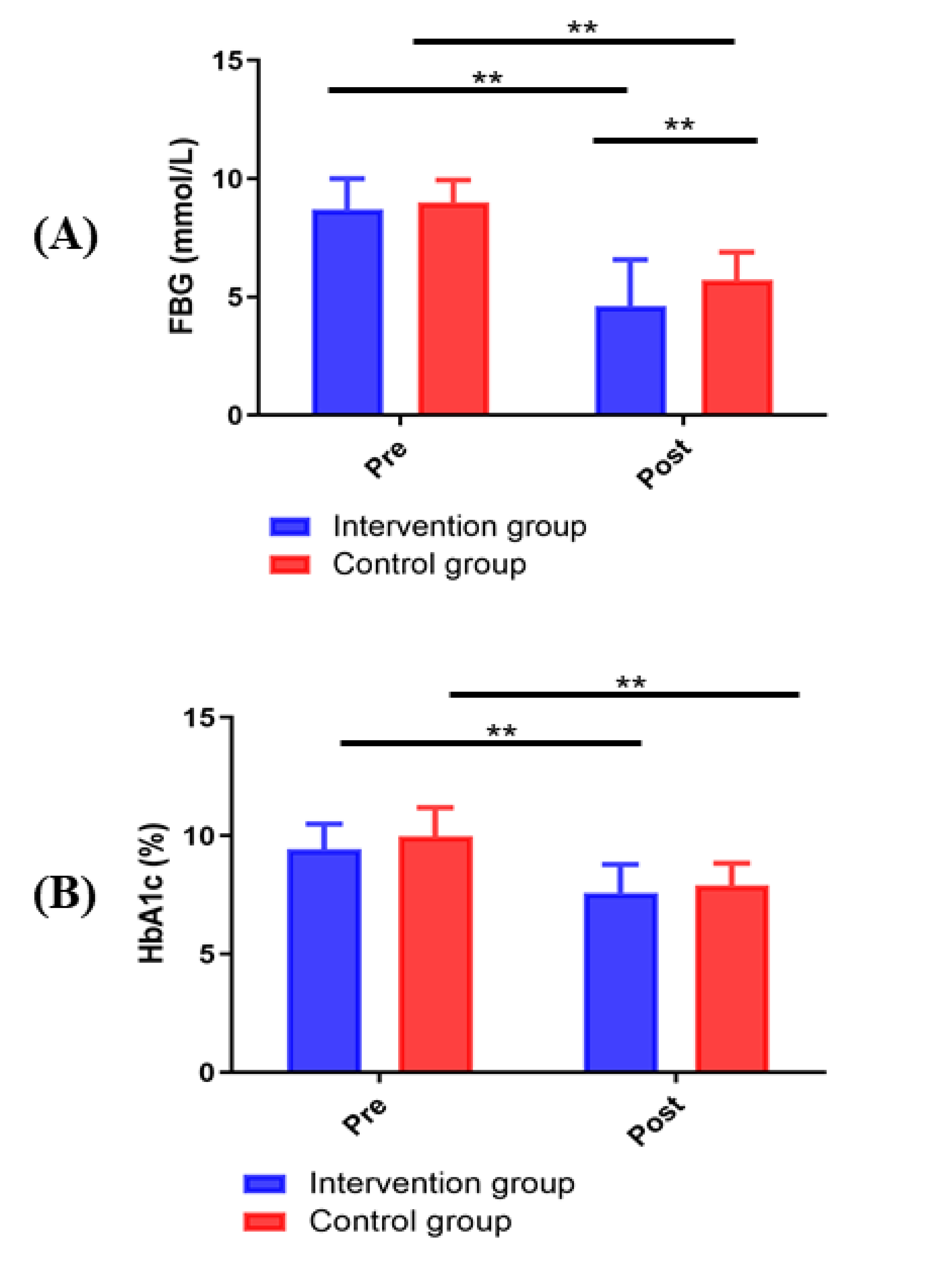 Fig. 8.Changes in FBG and HbA1c between groups. (A) FBG. (B) HbA1c. **p