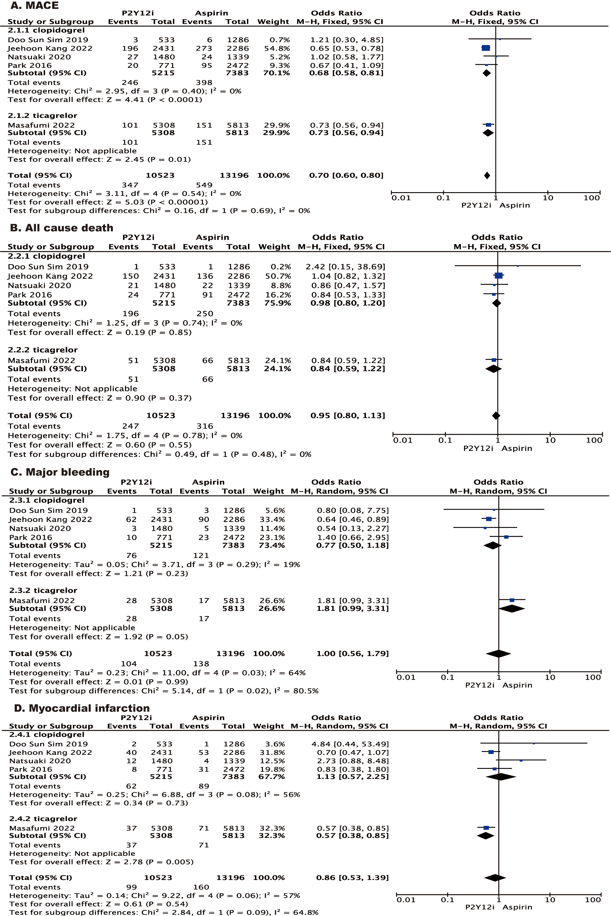inhibitor vs aspirin: (A) MACE; (B) all-cause death; (C) major bleeding; (D)