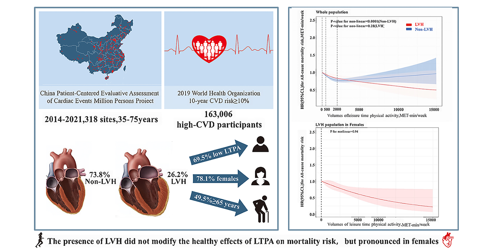 Regular leisure-time physical activity (LTPA) of at least 500 to 1000 metabolic equivalent of task (MET)-minutes per week without upper limits is consistently advised in patients at high cardiovascular risk [1], based on the evidence of its advantages in lowering the incidence and mortality of cardiovascular disease (CVD) [2]. Nevertheless, in this population, left ventricular hypertrophy (LVH) is a prevalent condition related to poor prognosis, and has a complicated relationship with LTPA at different levels [3, 4, 5]. Several studies have shown that moderate LTPA intensity and duration was related to a reduced risk of LVH and might produce regression of LVH among high-cardiovascular risk patients [6, 7, 8]. In contrast, some studies found that strenuous physical activity was linked with increased left ventricular mass, which may induce hypertrophy, moreover increase the risk of death [9, 10, 11, 12]. In healthy individuals, exercise is commonly linked with benign and reversible cardiac remodeling [9]. Nonetheless, in individuals with certain predisposing risk factors such as electrical cardiac abnormalities and pathological hypertrophy, etc., high-intensity exercise might be linked with an unfavorable prognosis and increased risk of mortality [13]. High-risk cardiovascular populations exhibited multiple risk factors, including hypertension, diabetes, etc., which might contribute to electrical cardiac remodeling, myocardial fibrosis, and pathological hypertrophy [14].